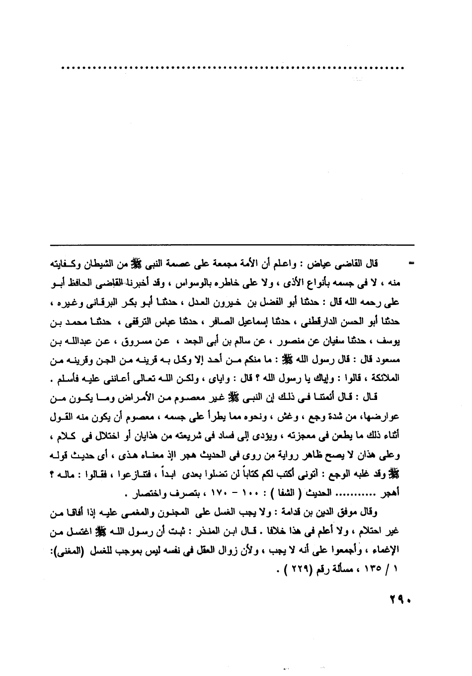 [ () ] قال القاضي عياض: واعلم أن الأمة مجمعة على عصمة النبي صلى اللَّه عليه وسلّم من الشيطان وكفايته منه، لا في جسمه بأنواع الأذى، ولا على خاطره بالوسواس،