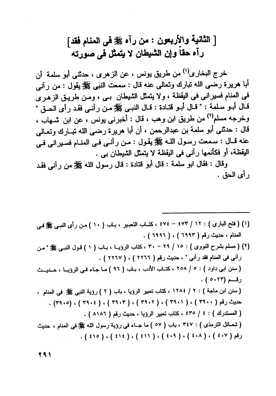 [ (1) ] (فتح الباري) : 12/ 473- 474، كتاب التعبير، باب (10) من رأى النبي صلى اللَّه عليه وسلّم في المنام، حديث رقم (6993) ، (6996) .