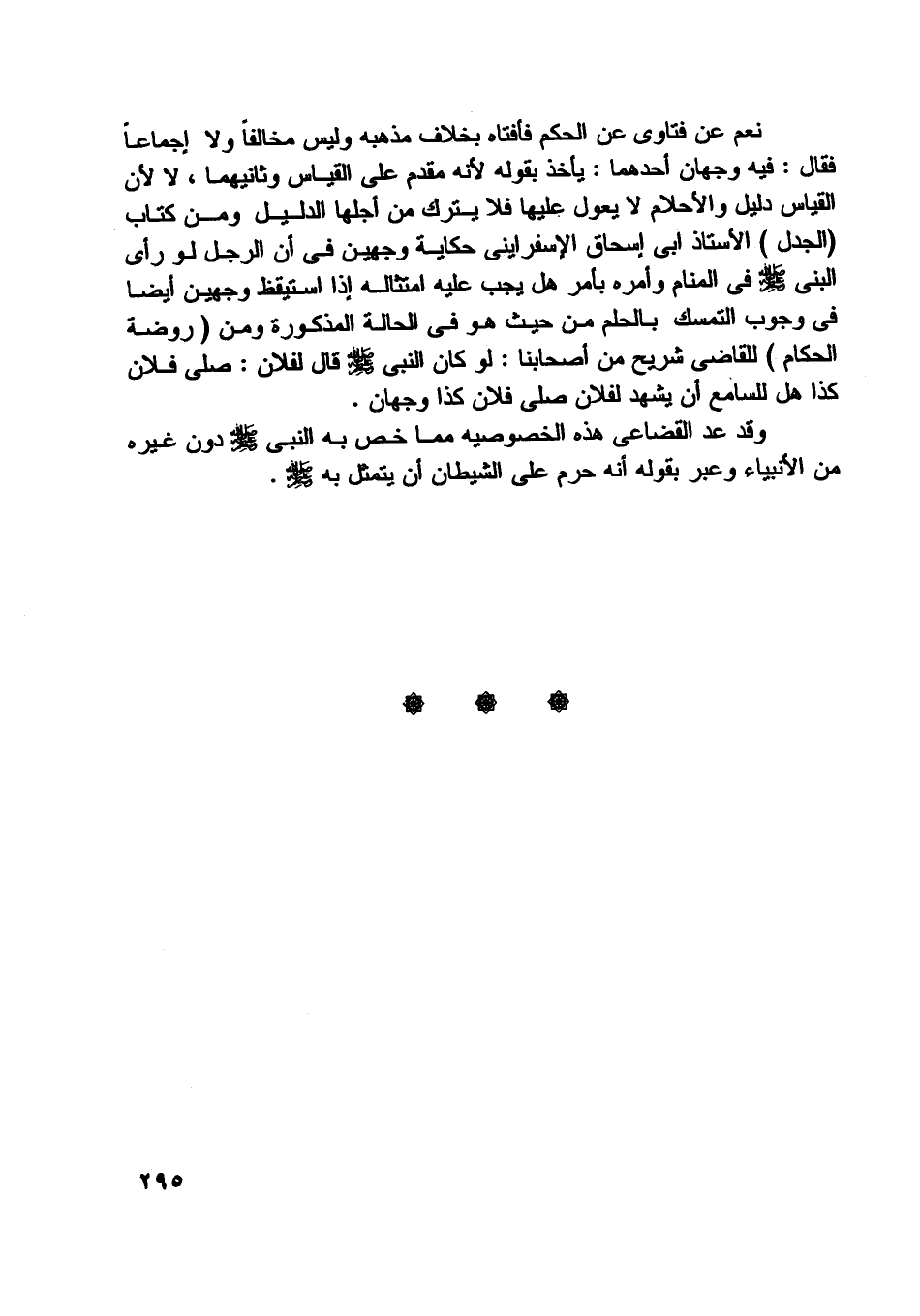 نعم عن فتاوى عن الحكم فأفتاه بخلاف مذهبه وليس مخالفا ولا إجماعا فقال: فيه وجهان أحدهما: يأخذ بقوله لأنه مقدم على القياس وثانيهما، لا لأن القياس دليل والأحلام لا يعول عليها فلا يترك من أجلها الدليل ومن كتاب (الجدل) الأستاذ ابى إسحاق الأسفرايني حكاية وجهين في أن الرجل لو رأى النبي صلى اللَّه عليه وسلّم في المنام وأمره بأمر هل يجب عليه امتثاله إذا استيقظ وجهين أيضا في وجوب التمسك بالحلم من حديث هو في الحالة المذكورة ومن (روضة الحكام) للقاضي شريح من أصحابنا: لو كان النبي صلى اللَّه عليه وسلّم قال لفلان: صلى فلان كذا هل للسامع أن يشهد لفلان صلى فلان كذا وجهان.