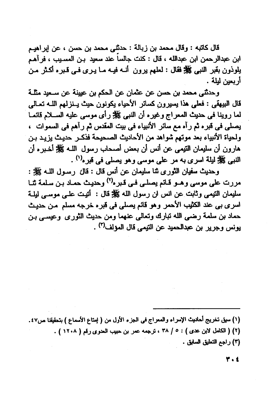 وحديث حماد بن سلمة ثنا سليمان التيمي وثابت عن أنس ان رسول اللَّه صلى اللَّه عليه وسلّم قال: أتيت على موسى ليلة اسرى بى عند الكثيب الأحمر وهو قائم يصلى في قبره خرجه مسلم من حديث حماد بن سلمة رضى اللَّه تبارك وتعالى عنهما ومن حديث الثوري وعيسى بن يونس وجرير بن عبد الحميد عن التيمي