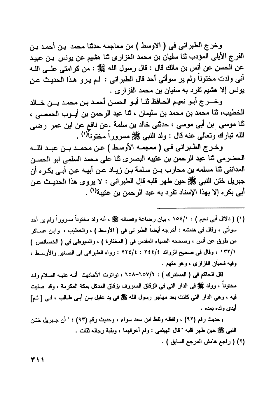 [ (1) ] (دلائل أبى نعيم) : 1/ 154، بيان رضاعه وفصاله صلى اللَّه عليه وسلّم، أنه ولد مختونا مسرورا ولم ير أحد سوأتي، وقال في هامشه: أخرجه أيضا الطبراني في (الأوسط) ، والخطيب، وابن عساكر من طرق عن أنس، وصححه الضياء المقدس في (المختارة) ، والسيوطي في (الخصائص) 1/ 132، وقال في صحيح الزوائد 4/ 244: 4/ 224: رواه الطبراني في الصغير والأوسط، وفيه شعبان الفزازى، وهو متهم.