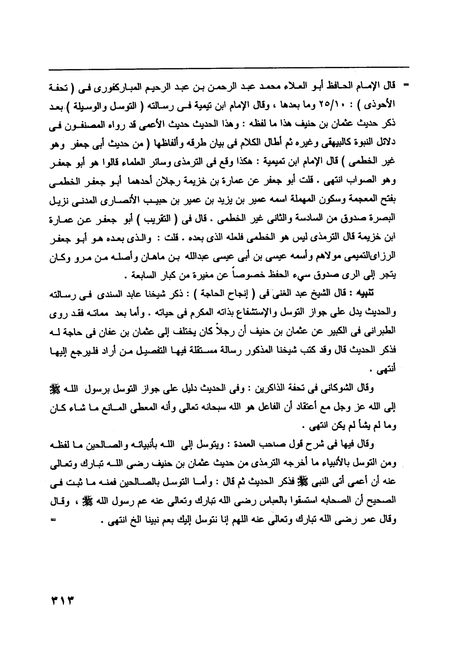 وقال فيها في شرح قول صاحب العمدة: ويتوسل إلى اللَّه بأنبيائه والصالحين ما لفظه ومن التوسل بالأنبياء ما أخرجه الترمذي من حديث عثمان بن حنيف رضى اللَّه تبارك وتعالى عنه أن أعمى أتى النبي صلى اللَّه عليه وسلّم فذكر الحديث ثم قال: وأما التوسل بالصالحين فمنه ما ثبت في الصحيح أن الصحابة استسقوا بالعباس رضى اللَّه تبارك وتعالى عنه عم رسول اللَّه صلى اللَّه عليه وسلّم، وقال وقال عمر رضى اللَّه تبارك وتعالى عنه اللَّهمّ إنا نتوسل إليك بعم نبينا إلخ انتهى.