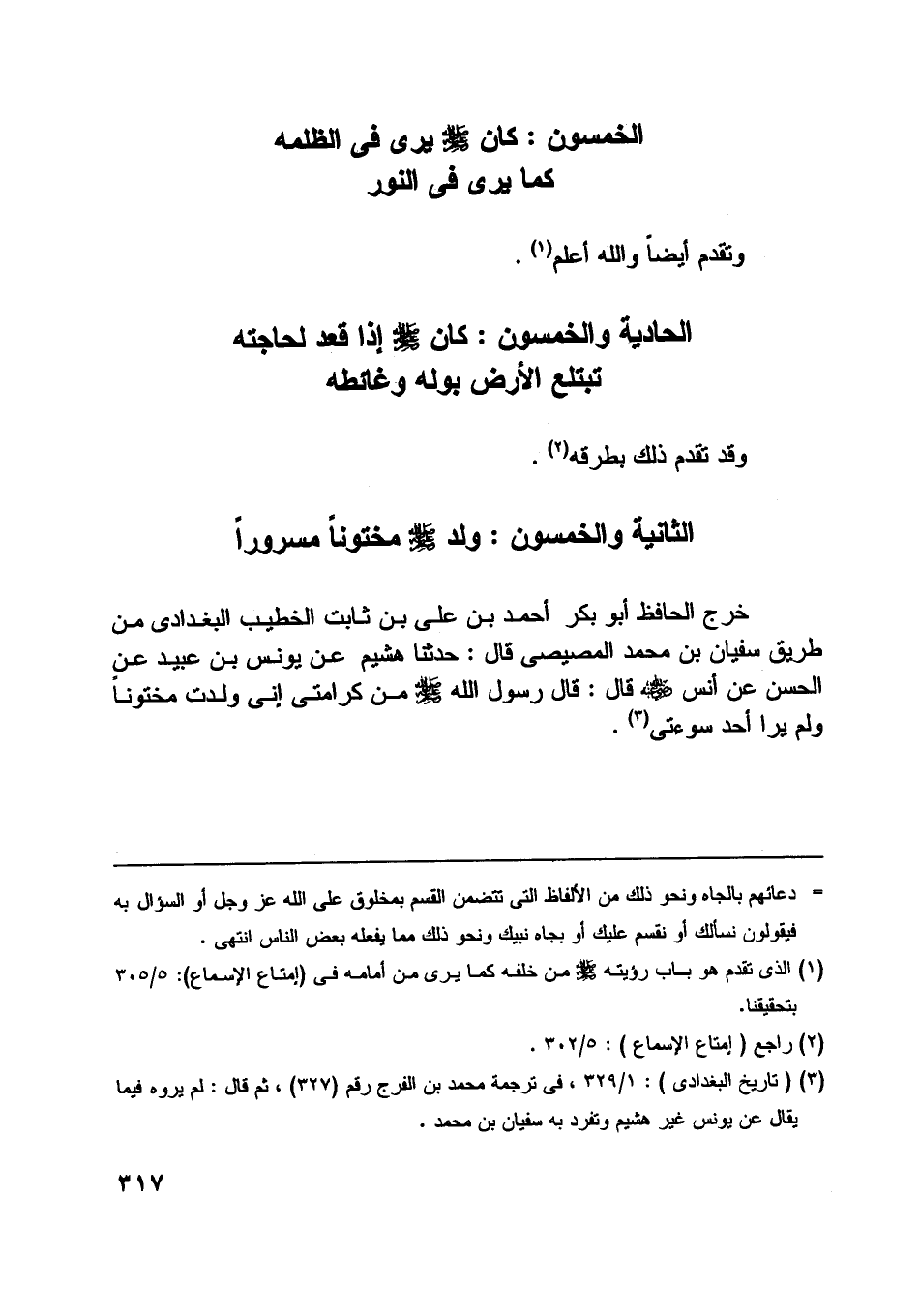 [ (1) ] الّذي تقدم هو باب رؤيته صلى اللَّه عليه وسلّم من خلفه كما يرى من أمامه في (إمتاع الأسماع) : 5/ 305 بتحقيقنا.