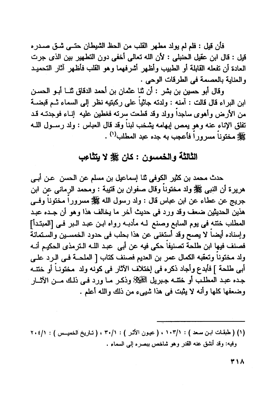 حدث محمد بن كثير الكوفي ثنا إسماعيل بن مسلم عن الحسن عن أبى هريرة أن النبي صلى اللَّه عليه وسلّم ولد مختونا وقال صفوان بن قتيبة: ومحمد الرماني عن ابن جريج عن عطاء عن ابن عباس قال: ولد رسول اللَّه صلى اللَّه عليه وسلّم مسرورا مختونا وفي هذين الحديثين ضعف وقد ورد في حديث آخر ما يخالف هذا وهو أن جده عبد المطلب ختنه في يوم السابع وصنع له مأدبة رواه ابن عبد البر في [المبتدإ] وإسناده أيضا لا يصح وقد استغنى عن هذا بحلب في حدود الخمسين والستمائة فصنف فيها ابن طلحة تصنيفا حكى فيه عن أبى عبد اللَّه الترمذي الحكيم أنه ولد مختونا وتعقبه الكمال عمر بن العديم فصنف كتاب [الملحة في الرد على أبى طلحة] فأبدع وأجاد ذكره في اختلاف الآثار في كونه ولد مختونا أو ختنه جده عبد المطلب أو ختنه جبريل عليه السلام وذكر ما ورد في ذلك من الآثار وضعفها كلها وأنه لا يثبت في هذا شيء من ذلك واللَّه أعلم.