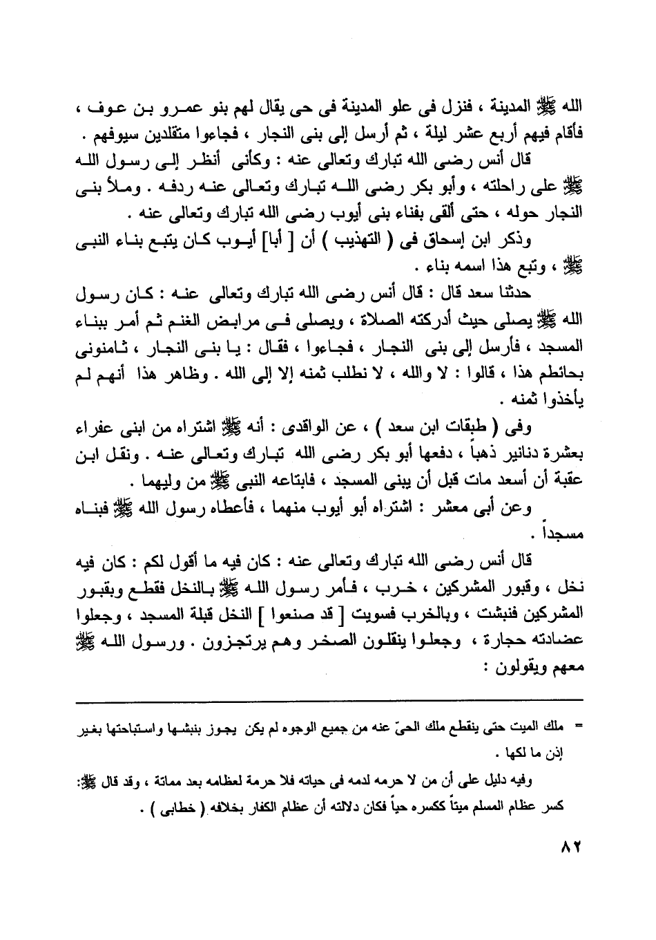 قال أنس رضى اللَّه تبارك وتعالى عنه: كان فيه ما أقول لكم: كان فيه نخل، وقبور المشركين، خرب، فأمر رسول اللَّه صلى اللَّه عليه وسلّم بالنخل فقطع وبقبور المشركين فنبشت، وبالخرب فسويت [قد صنعوا] النخل قبلة المسجد، وجعلوا عضادته حجارة، وجعلوا ينقلون الصخر وهم يرتجزون. ورسول اللَّه صلى اللَّه عليه وسلّم معهم ويقولون:
