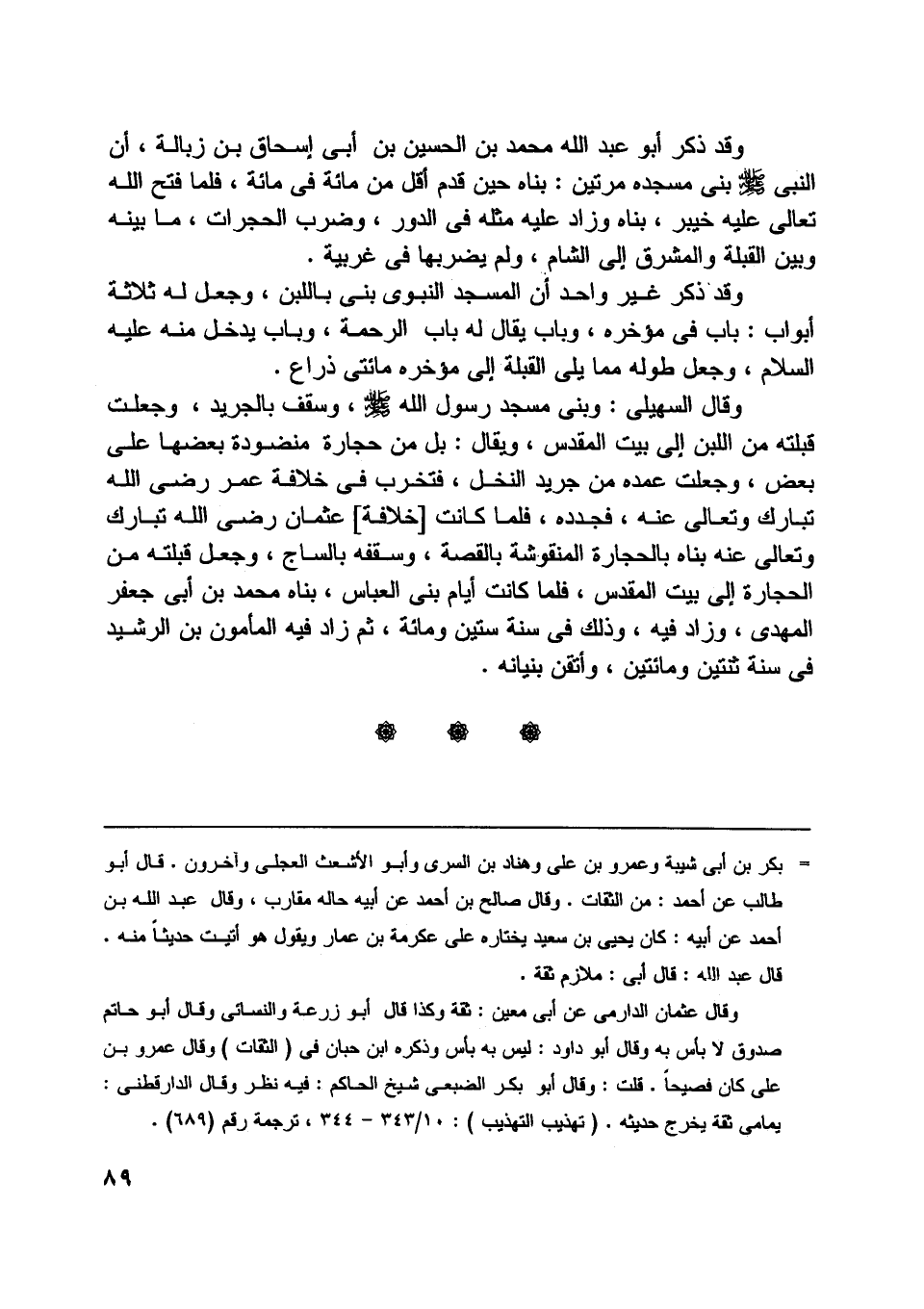 وقال السهيليّ: وبنى مسجد رسول اللَّه صلى اللَّه عليه وسلّم، وسقف بالجريد، وجعلت قبلته من اللبن إلى بيت المقدس، ويقال: بل من حجارة منضودة بعضها على بعض، وجعلت عمده من جريد النخل، فتخرب في خلافة عمر رضى اللَّه تبارك وتعالى عنه، فجدده، فلما كانت [خلافة] عثمان رضى اللَّه تبارك وتعالى عنه بناه بالحجارة المنقوشة بالقصة، وسقفه بالساج، وجعل قبلته من الحجارة إلى بيت المقدس، فلما كانت أيام بنى العباس، بناه محمد بن أبى جعفر المهدي، وزاد فيه، وذلك في سنة ستين ومائة، ثم زاد فيه المأمون بن الرشيد في سنة ثنتين ومائتين، وأتقن بنيانه.