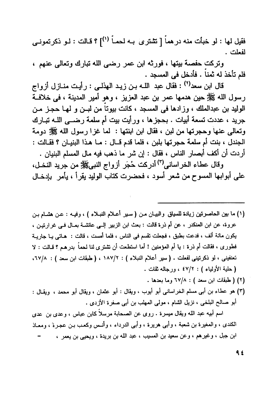 وقال عطاء الخراساني [ (3) ] أدركت حجر أزواج النبي صلى اللَّه عليه وسلّم من جريد النخل، على أبوابها المسوح من شعر أسود، فحضرت كتاب الوليد يقرأ، يأمر بإدخال