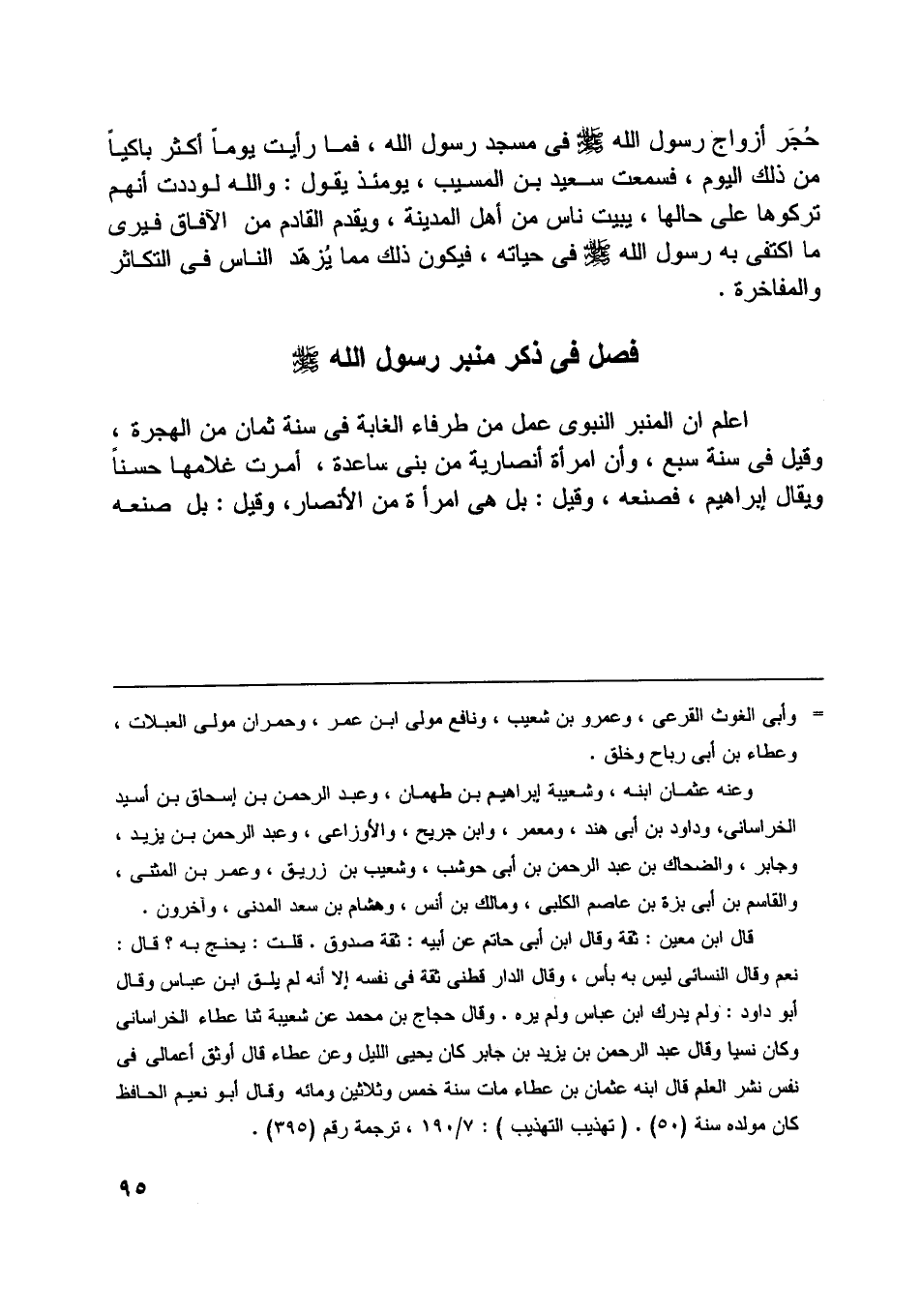 حجر أزواج رسول اللَّه صلى اللَّه عليه وسلّم في مسجد رسول اللَّه، فما رأيت يوما أكثر باكيا من ذلك اليوم، فسمعت سعيد بن المسيب، يومئذ يقول: واللَّه لوددت أنهم تركوها على حالها، يبيت ناس من أهل المدينة، ويقدم القادم من الآفاق فيرى ما اكتفى به رسول اللَّه صلى اللَّه عليه وسلّم في حياته، فيكون ذلك مما يزهّد الناس في التكاثر والمفاخرة.