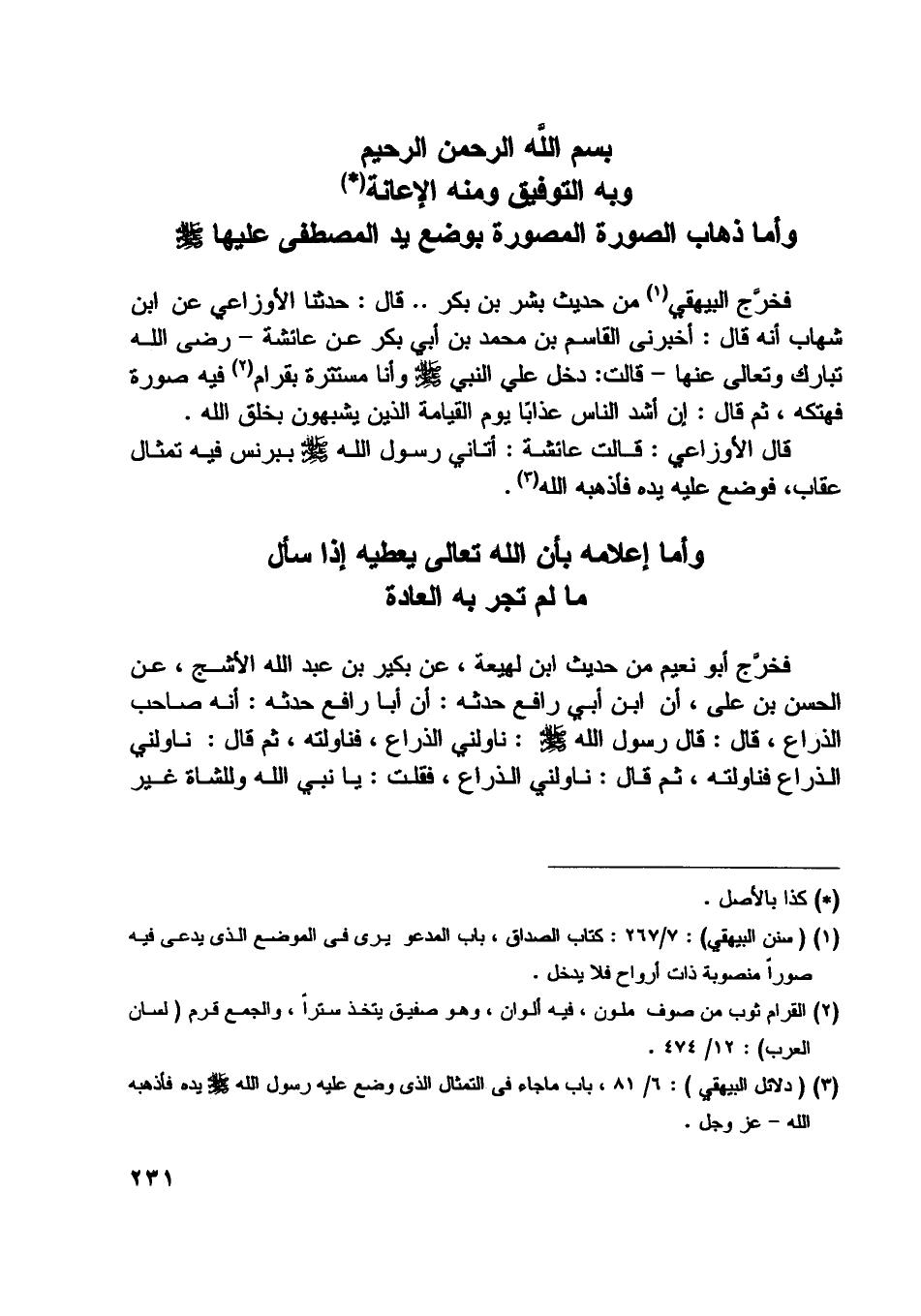 [ (4) ] (دلائل البيهقي) : 6/ 81، باب ما جاء في التمثال الّذي وضع عليه رسول اللَّه صلّى اللَّه عليه وسلّم يده فأذهبه اللَّه- عز وجل.
