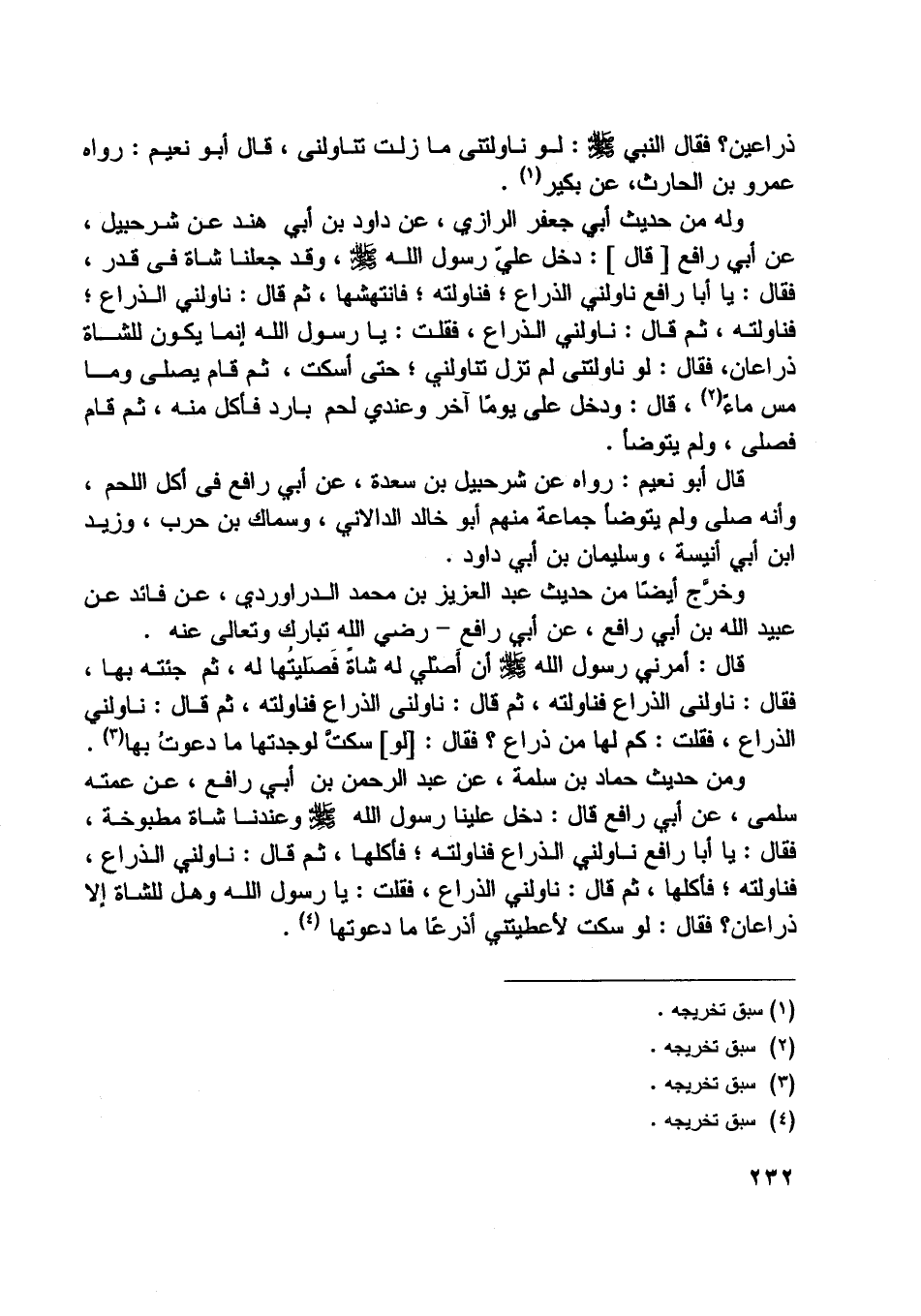 ومن حديث حماد بن سلمة، عن عبد الرحمن بن أبي رافع، عن عمته سلمى، عن أبي رافع قال: دخل علينا رسول اللَّه صلّى اللَّه عليه وسلّم وعندنا شاة مطبوخة، فقال: يا أبا رافع ناولني الذراع فناولته، فأكلها، ثم قال: ناولني الذراع، فناولته، فأكلها، ثم قال: ناولني الذراع، فقلت: يا رسول اللَّه وهل للشاة إلا ذراعان؟ فقال: لو سكت لأعطيتني أذرعا ما دعوتها [ (4) ] .