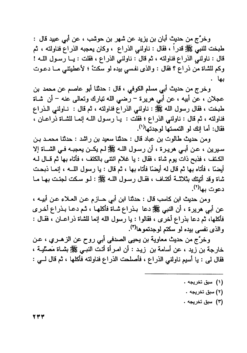 وخرج من حديث أبي مسلم الكوفي، قال: حدثنا أبو عاصم عن محمد بن عجلان، عن أبيه، عن أبي هريرة- رضي اللَّه تبارك وتعالى عنه- أن شاة طبخت، فقال رسول اللَّه صلّى اللَّه عليه وسلّم: ناولني الذراع فناولته، ثم قال: ناولني الذراع فناولته، ثم قال: ناولني الذراع، فقلت: يا رسول اللَّه إنما للشاة ذراعان، فقال: أما إنك لو التمستها لوجدتها [ (1) ] .