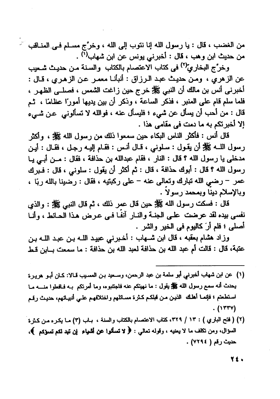 [ (2) ] (فتح الباري) : 13/ 329، كتاب الاعتصام بالكتاب والسنة، باب (3) ما يكره من كثرة السؤال، ومن تكلف ما لا يعنيه، وقوله تعالى: لا تَسْئَلُوا عَنْ أَشْياءَ إِنْ تُبْدَ لَكُمْ تَسُؤْكُمْ، حديث رقم (7294) .