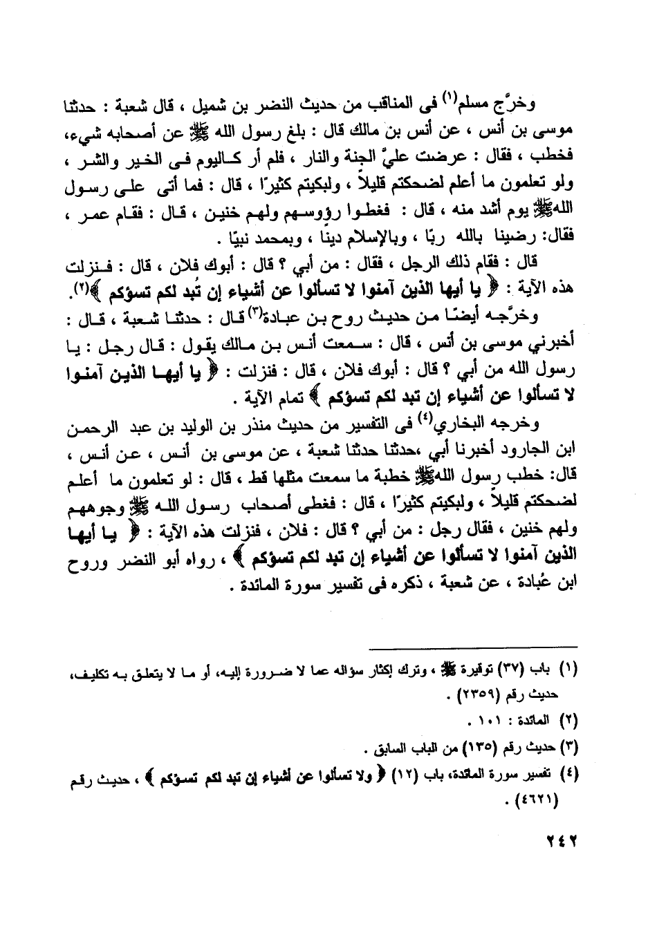 [ (4) ] تفسير سورة المائدة، باب (12) لا تَسْئَلُوا عَنْ أَشْياءَ إِنْ تُبْدَ لَكُمْ تَسُؤْكُمْ، حديث رقم (4621) .