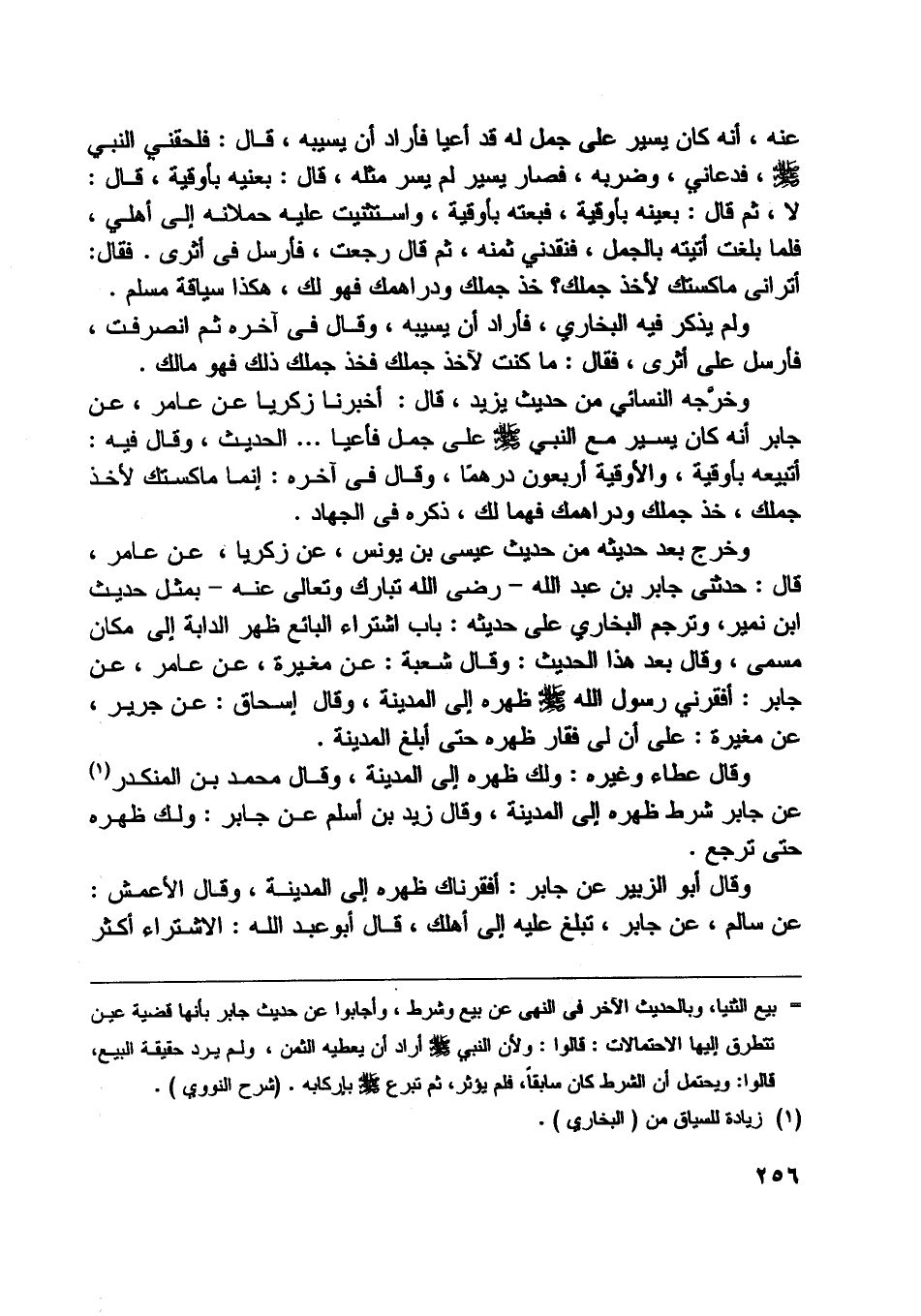 عنه، أنه كان يسير على جمل له قد أعيا فأراد أن يسيبه، قال: فلحقني النبي صلّى اللَّه عليه وسلّم، فدعاني، وضربه، فصار يسير لم يسر مثله، قال: بعنيه بأوقية، قال: