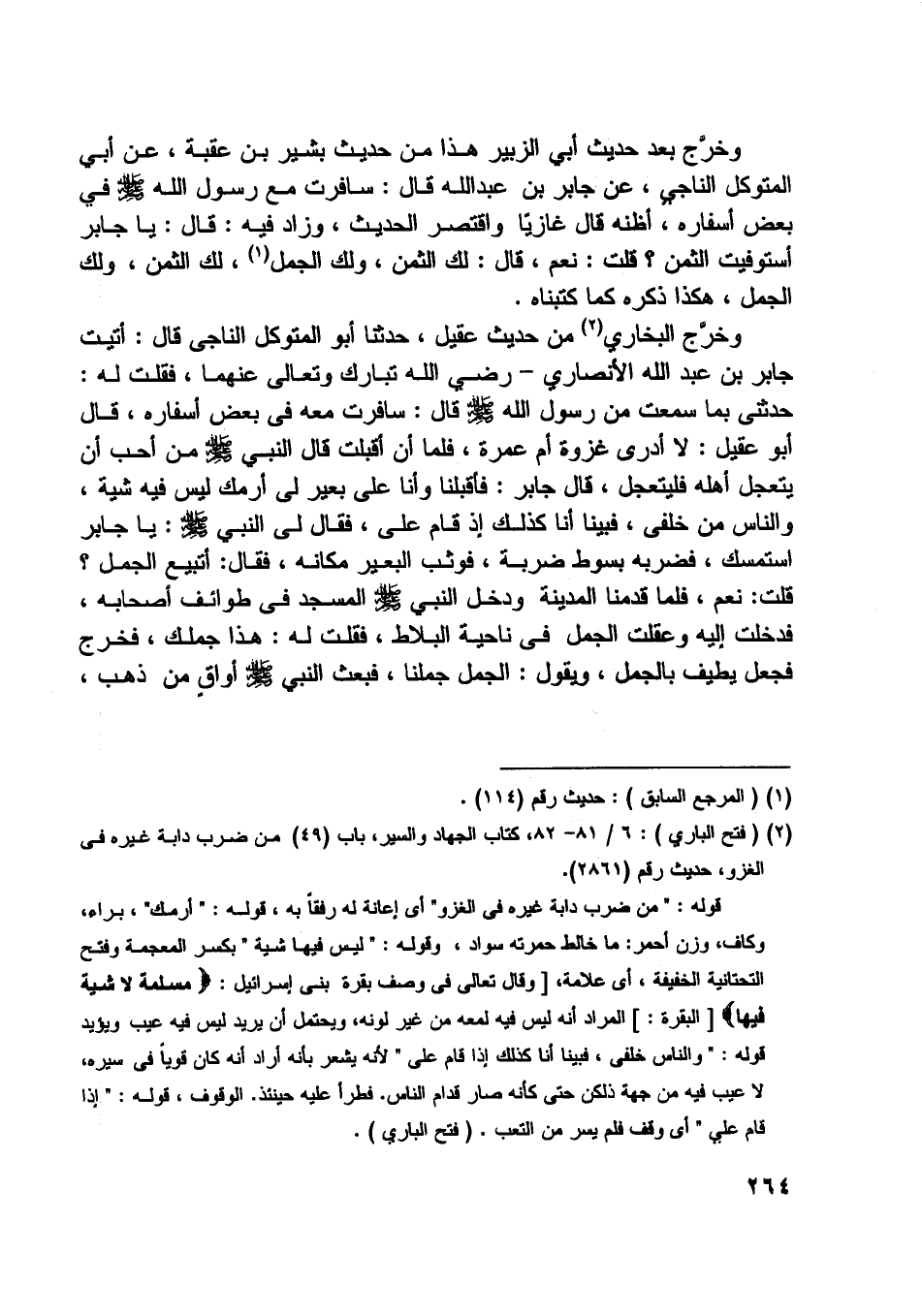 وخرّج بعد حديث أبي الزبير هذا من حديث بشير بن عقبة، عن أبي المتوكل الناجي، عن جابر بن عبد اللَّه قال: سافرت مع رسول اللَّه صلّى اللَّه عليه وسلّم في بعض أسفاره، أظنه قال غازيا واقتصر الحديث، وزاد فيه: قال: يا جابر استوفيت الثمن؟ قلت: نعم، قال: لك الثمن، ولك الجمل [ (1) ] ، لك الثمن، ولك الجمل،