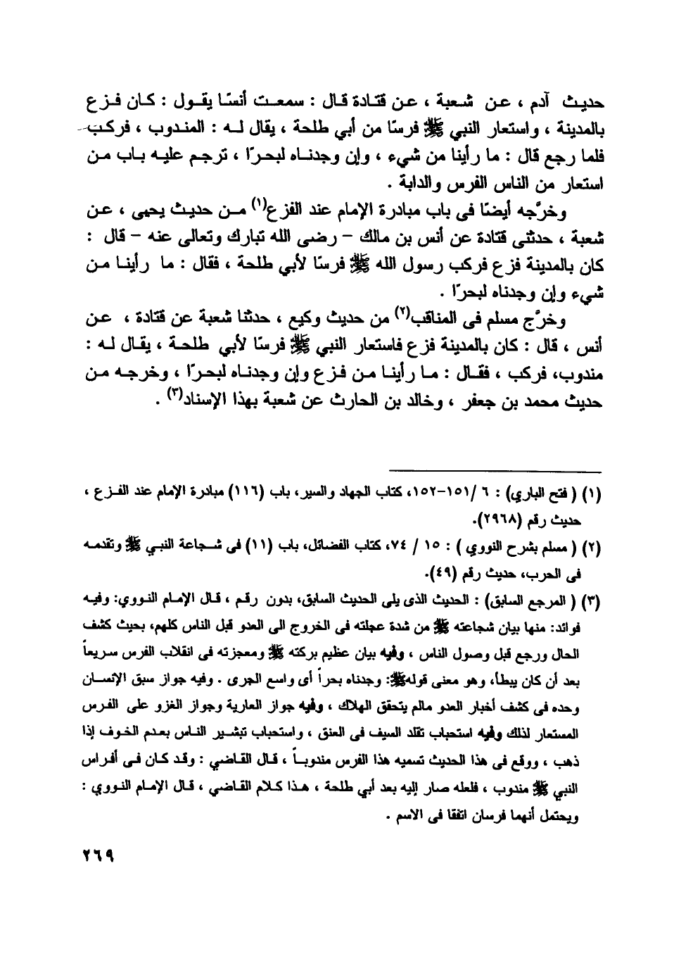 [ (3) ] (المرجع السابق) : الحديث الّذي يلي الحديث السابق، بدون رقم، قال الإمام النووي: وفيه فوائد: منها بيان شجاعته صلّى اللَّه عليه وسلّم من شدة عجلته في الخروج الى العدو قبل الناس كلهم، بحيث كشف الحال ورجع قبل وصول الناس، وفيه بيان عظيم بركته صلّى اللَّه عليه وسلّم ومعجزته في انقلاب الفرس سريعا بعد أن كان يبطأ، وهو معنى قوله صلّى اللَّه عليه وسلّم: وجدناه بحرا أي واسع الجرى. وفيه جواز سبق الإنسان وحده في كشف أخبار العدو ما لم يتحقق الهلاك، وفيه جواز العارية وجواز الغزو على الفرس المستعار لذلك وفيه استحباب تقلد السيف في العنق، واستحباب تبشير الناس بعدم الخوف إذا ذهب، ووقع في هذا الحديث تسميه هذا الفرس مندوبا، قال القاضي: وقد كان في أفراس النبي صلّى اللَّه عليه وسلّم مندوب، فلعله صار إليه بعد أبي طلحة، هذا كلام القاضي، قال الإمام النووي: