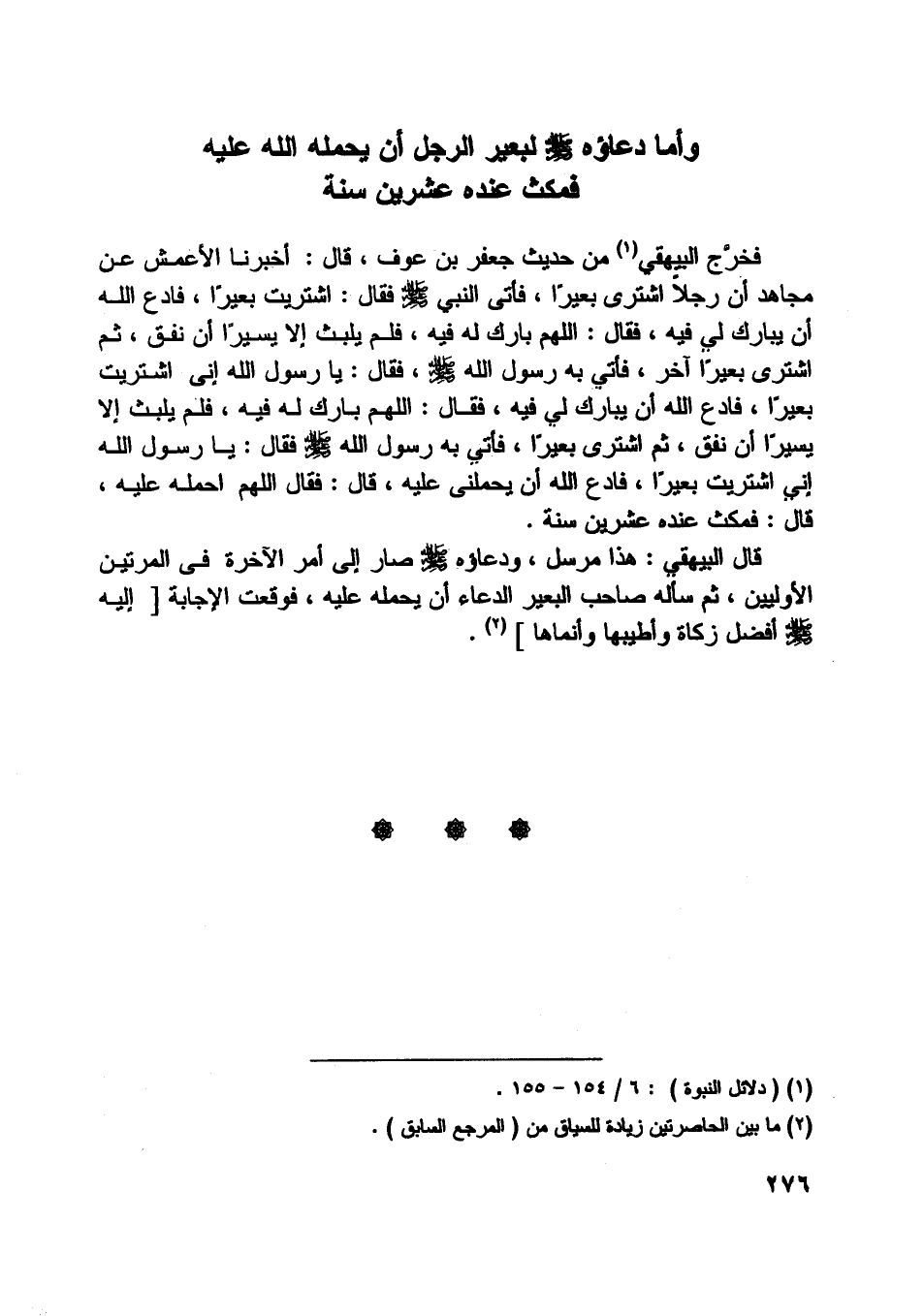 قال البيهقي: هذا مرسل، ودعاؤه صلّى اللَّه عليه وسلّم صار إلى أمر الآخرة في المرتين الأوليين، ثم سأله صاحب البعير الدعاء أن يحمله عليه، فوقعت الإجابة [إليه صلّى اللَّه عليه وسلّم أفضل زكاة وأطيبها وأنماها] [ (2) ] .