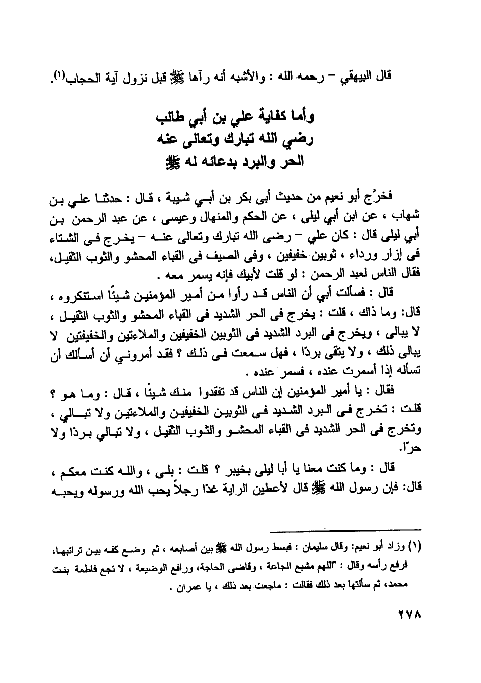وأما كفاية علي بن أبي طالب رضي اللَّه تبارك وتعالى عنه الحر والبرد بدعائه له صلّى اللَّه عليه وسلّم