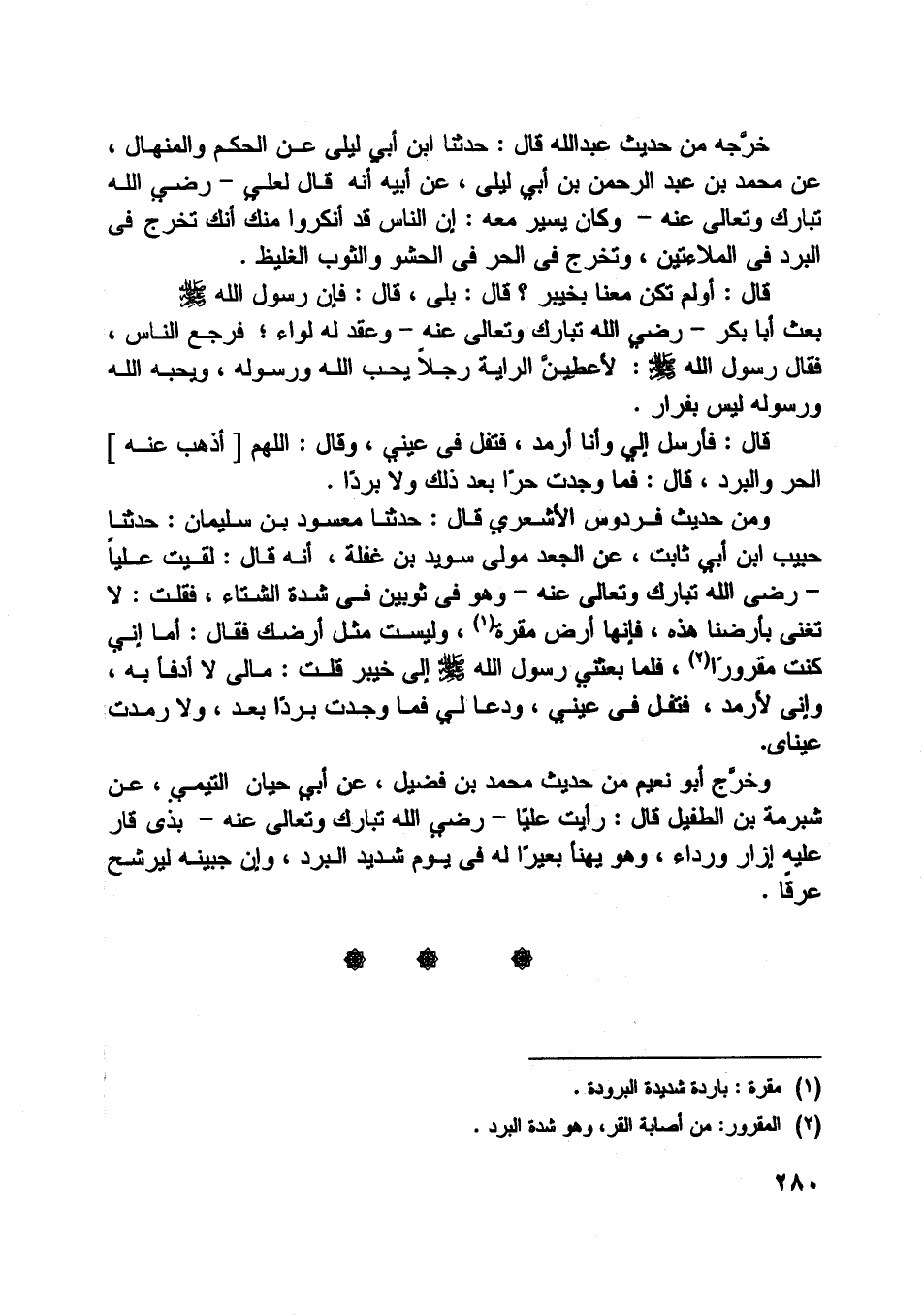 ومن حديث فردوس الأشعري قال: حدثنا مسعود بن سليمان: حدثنا حبيب ابن أبي ثابت، عن الجعد مولى سويد بن غفلة، أنه قال: لقيت عليا- رضى اللَّه تبارك وتعالى عنه- وهو في ثوبين في شدة الشتاء، فقلت: لا تغني بأرضنا هذه، فإنّها أرض مقرة [ (1) ] ، وليست مثل أرضك فقال: أما إني كنت مقرورا [ (2) ] ، فلما بعثني رسول اللَّه صلّى اللَّه عليه وسلّم إلى خيبر قلت: ما لي لا أدفأ به، وإني لأرمد، فتفل في عيني، ودعا لي فما وجدت بردا بعد، ولا رمدت عيناي.
