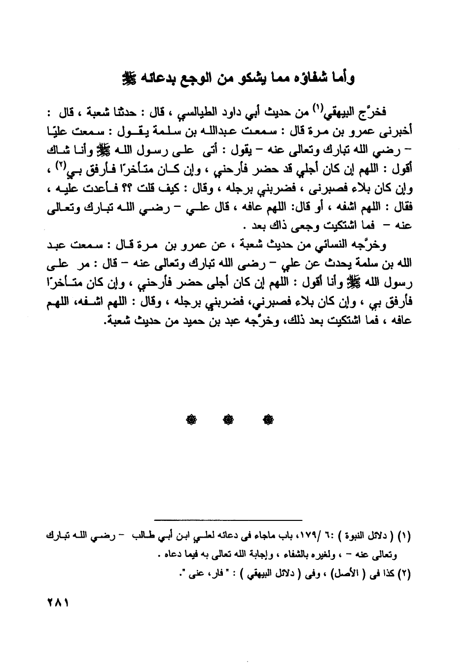 [ (1) ] (دلائل النبوة) : 6/ 179، باب ما جاء في دعائه لعلي ابن أبي طالب- رضي اللَّه تبارك وتعالى عنه-، ولغيره بالشفاء، وإجابة اللَّه تعالى به فيما دعاه.