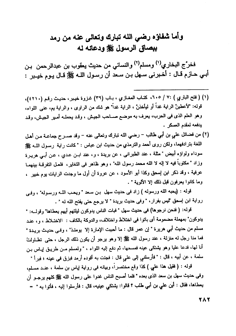 وأما شفاؤه رضي اللَّه تبارك وتعالى عنه من رمد ببصاق الرسول صلّى اللَّه عليه وسلّم ودعائه له