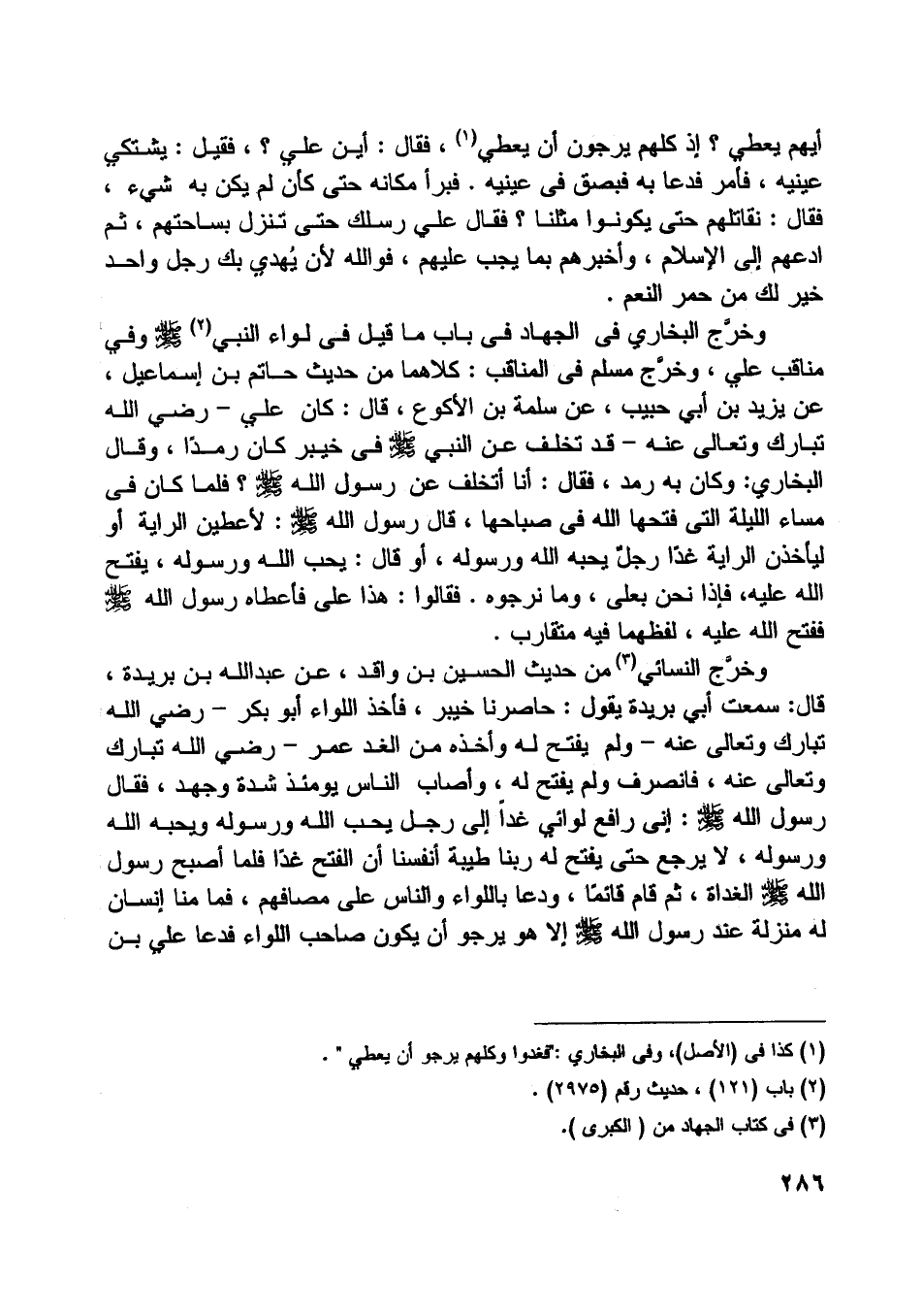 وخرّج البخاري في الجهاد في باب ما قيل في لواء النبي [ (2) ] صلّى اللَّه عليه وسلّم وفي مناقب علي، وخرّج مسلم في المناقب: كلاهما من حديث حاتم بن إسماعيل، عن يزيد بن أبي حبيب، عن سلمة بن الأكوع، قال: كان علي- رضي اللَّه تبارك وتعالى عنه- قد تخلف عن النبي صلّى اللَّه عليه وسلّم في خيبر كان رمدا، وقال البخاري: وكان به رمد، فقال: أنا أتخلف عن رسول اللَّه صلّى اللَّه عليه وسلّم؟ فلما كان في مساء الليلة التي فتحها اللَّه في صباحها، قال رسول اللَّه صلّى اللَّه عليه وسلّم: لأعطين الراية أو ليأخذن الراية غدا رجل يحبه اللَّه ورسوله، أو قال: يحب اللَّه ورسوله، يفتح اللَّه عليه، فإذا نحن بعلي، وما نرجوه. فقالوا: هذا على فأعطاه رسول اللَّه صلّى اللَّه عليه وسلّم ففتح اللَّه عليه،