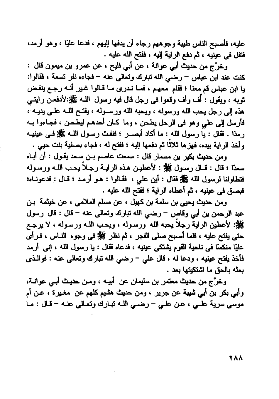 يا ابن عباس قم معنا، فقام معهم، فما ندري ما قالوا غير أنه رجع ينفض ثوبه، ويقول: أف وأف وقعوا في رجل قال فيه رسول اللَّه صلّى اللَّه عليه وسلّم: لأدفعن رايتي هذه إلى رجل يحب اللَّه ورسوله، ويحبه اللَّه ورسوله، يفتح اللَّه على يديه، فأرسل إلى علي وهو في الرحل يطحن، وما كان أحدهم ليطحن، فجاءوا به رمدا. فقال: يا رسول اللَّه: ما أكاد أبصر، فنفث رسول اللَّه صلّى اللَّه عليه وسلّم في عينيه وأخذ الراية بيده، فهزها ثلاثا ثم دفعها إليه، ففتح له،