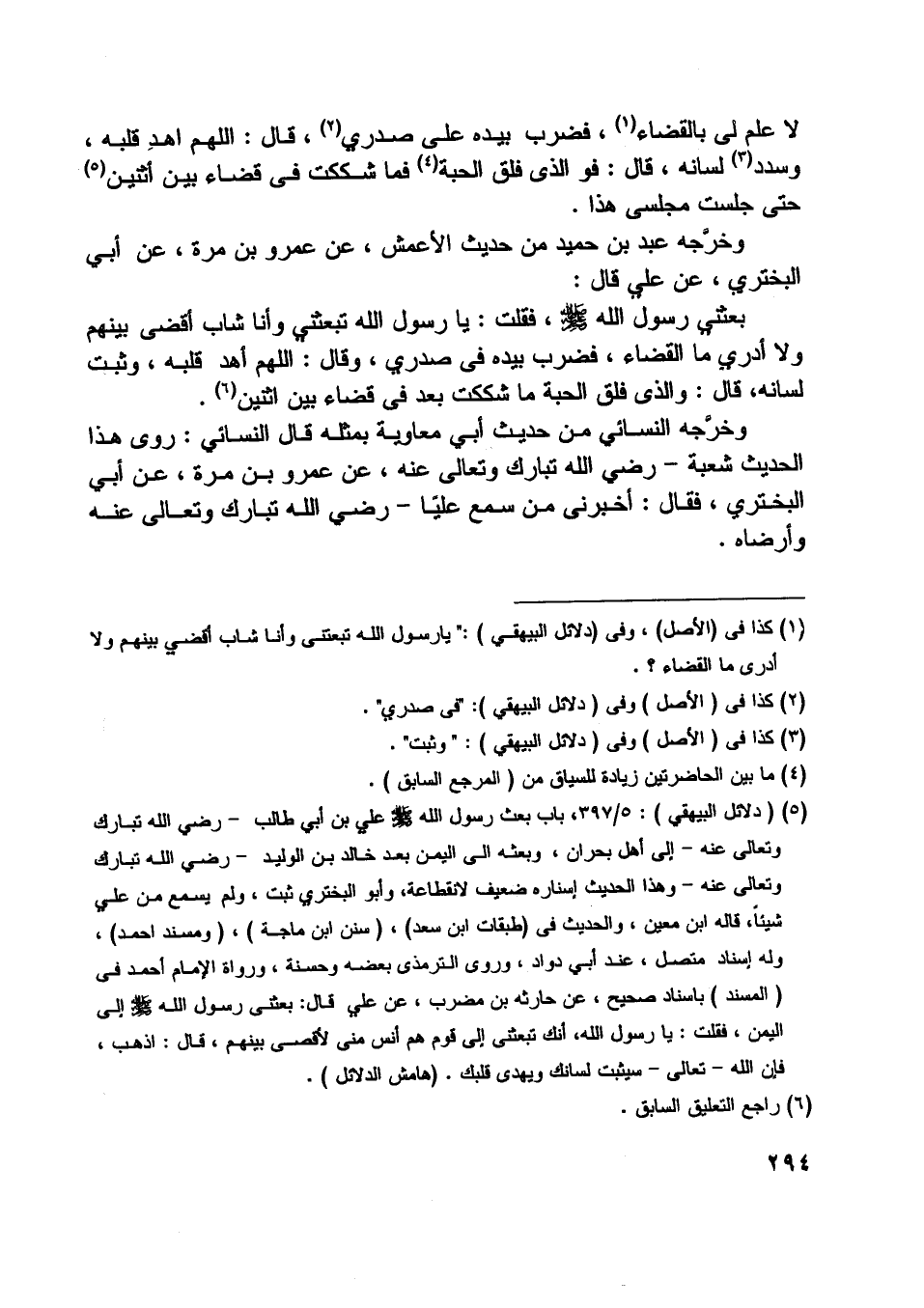 ورواه الإمام أحمد في (المسند) باسناد صحيح، عن حارثة بن مضرب، عن علي قال: بعثني رسول اللَّه صلّى اللَّه عليه وسلّم إلى اليمن، فقلت: يا رسول اللَّه، أنك تبعثني إلى قوم هم أنس منى لأقصى بينهم، قال: اذهب، فإن اللَّه- تعالى- سيثبت لسانك ويهدى قلبك.