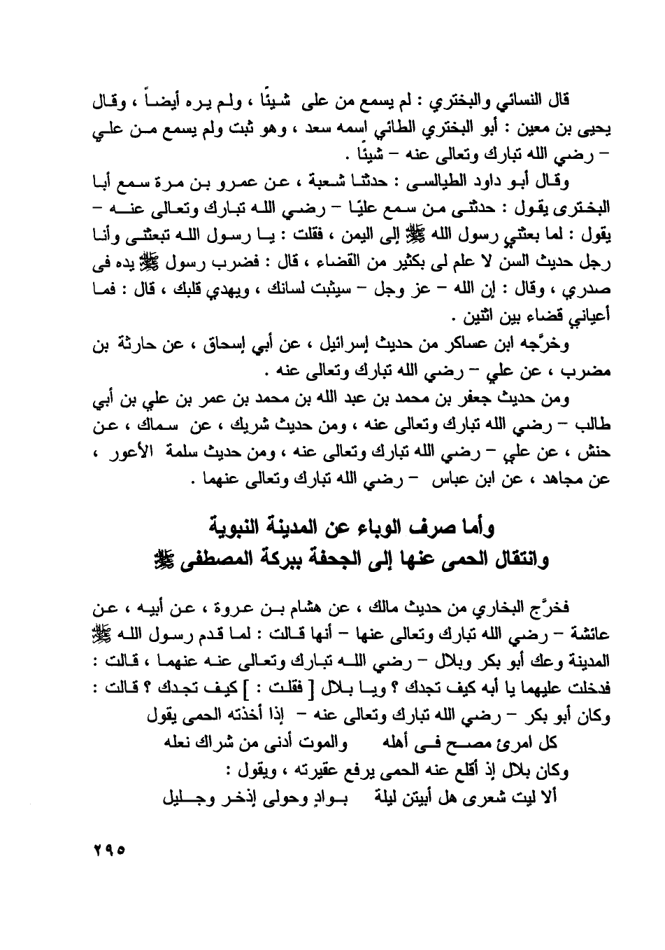 فخرّج البخاري من حديث مالك، عن هشام بن عروة، عن أبيه، عن عائشة- رضي اللَّه تبارك وتعالى عنها- أنها قالت: لما قدم رسول اللَّه صلّى اللَّه عليه وسلّم المدينة وعك أبو بكر وبلال- رضي اللَّه تبارك وتعالى عنهما، قالت: