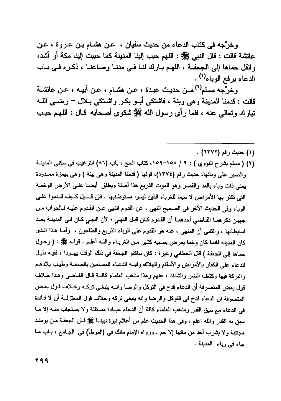 [ (2) ] (مسلم بشرح النووي) : 9/ 158- 159، كتاب الحج، باب (86) الترغيب في سكنى المدينة والصبر على وبائها، حديث رقم (1374) ، قولها (قدمنا المدينة وهي بيئة) وهي بهمزة ممدودة يعنى ذات وباء بالمد والقصر وهو الموت الذريع هذا أصلة ويطلق أيضا على الأرض الوخمة التي تكثر بها الأمراض لا سيما للغرباء الذين ليسوا مستوطنيها. فإن قيل كيف قدموا على الوباء وفي الحديث الآخر في الصحيح النهى، عن القدوم النهى عن القدوم عليه فالجواب من جهتين ذكرهما القاضي أحدهما أن القدوم كان قبل النهي، لأن النهي كان في المدينة بعد استيطانها، والثاني أن المنهي، عنه هو القدوم على الوباء الذريع والطاعون، وأما هذا الّذي كان المدينة فإنما كان وخما يمرض بسببه كثير من الغرباء واللَّه أعلم.