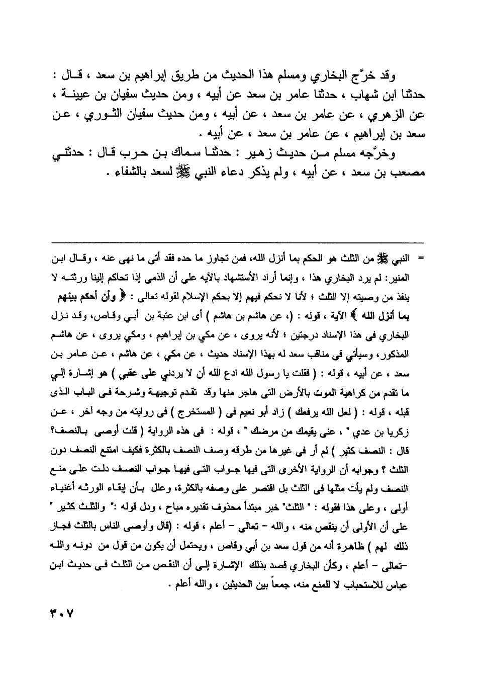 [ () ] النبي صلّى اللَّه عليه وسلّم من الثلث هو الحكم بما أنزل اللَّه، فمن تجاوز ما حده فقد أتى ما نهى عنه، وقال ابن المنير: لم يرد البخاري هذا، وإنما أراد الاستشهاد بالآية على أن الذمي إذا تحاكم إلينا ورثته لا ينفذ من وصيته إلا الثلث، لأنا لا نحكم فيهم إلا بحكم الإسلام لقوله تعالى: وَأَنِ احْكُمْ بَيْنَهُمْ بِما أَنْزَلَ اللَّهُ الآية، قوله: (، عن هاشم بن هاشم) أي ابن عتبة بن أبي وقاص، وقد نزل البخاري في هذا الإسناد درجتين، لأنه يروى، عن مكي بن إبراهيم، ومكي يروى، عن هاشم المذكور، وسيأتي في مناقب سعد له بهذا الإسناد حديث، عن مكي، عن هاشم، عن عامر بن سعد، عن أبيه، قوله: (فقلت يا رسول اللَّه ادع اللَّه أن لا يردني على عقبي) هو إشارة إلي ما تقدم من كراهية الموت بالأرض التي هاجر منها وقد تقدم توجيهه وشرحه في الباب الّذي قبله،
