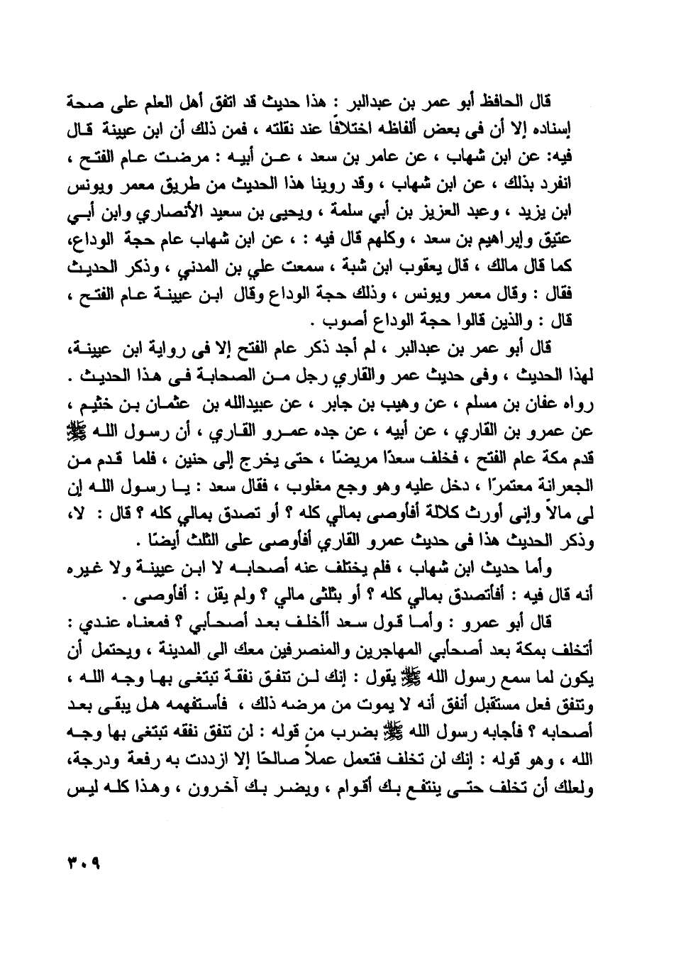 قال الحافظ أبو عمر بن عبد البر: هذا حديث قد اتفق أهل العلم على صحة إسناده إلا أن في بعض ألفاظه اختلافا عند نقلته، فمن ذلك أن ابن عيينة قال فيه: عن ابن شهاب، عن عامر بن سعد، عن أبيه: مرضت عام الفتح، انفرد بذلك، عن ابن شهاب، وقد روينا هذا الحديث من طريق معمر ويونس ابن يزيد، وعبد العزيزي بن أبي سلمة، ويحيى بن سعيد الأنصاري وابن أبي عتيق وإبراهيم بن سعد، وكلهم قال فيه:، عن ابن شهاب عام حجة الوداع، كما قال مالك، قال يعقوب ابن شبة، سمعت علي بن المدني، وذكر الحديث فقال: وقال معمر ويونس، وذلك حجة الوداع وقال ابن عيينة عام الفتح، قال: والذين قالوا حجة الوداع أصوب.