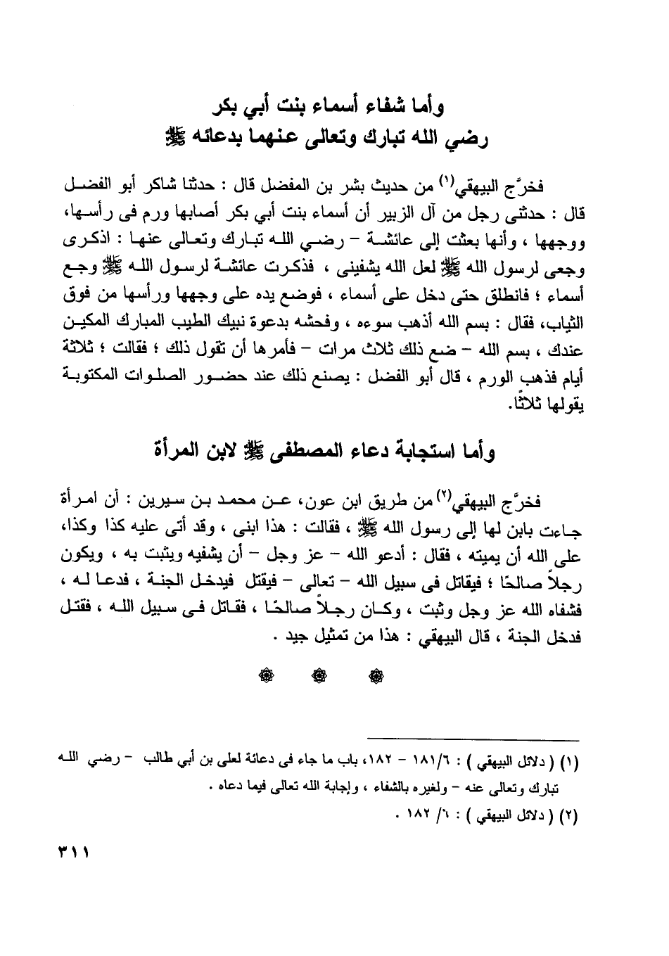 [ (1) ] (دلائل البيهقي) : 6/ 181- 182، باب ما جاء في دعائه لعلى بن أبي طالب- رضي اللَّه تبارك وتعالى عنه- ولغيره بالشفاء، وإجابة اللَّه تعالى فيما دعاه.