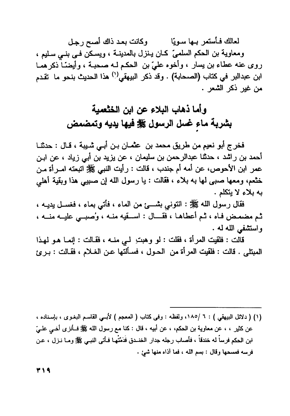 وفي كتاب (المعجم) لأبي القاسم البغوي، بإسناده، عن كثير، عن معاوية بن الحكم، عن أبيه، قال: كنا مع رسول اللَّه صلّى اللَّه عليه وسلّم فأنزى أخي عليّ ابن الحكم فرسا له خندقا، فأصاب رجله جدار الخندق فدمّتها فأتى النبي صلّى اللَّه عليه وسلّم وما نزل، عن فرسه فمسحها وقال: بسم اللَّه، فما آذاه منها شيء.