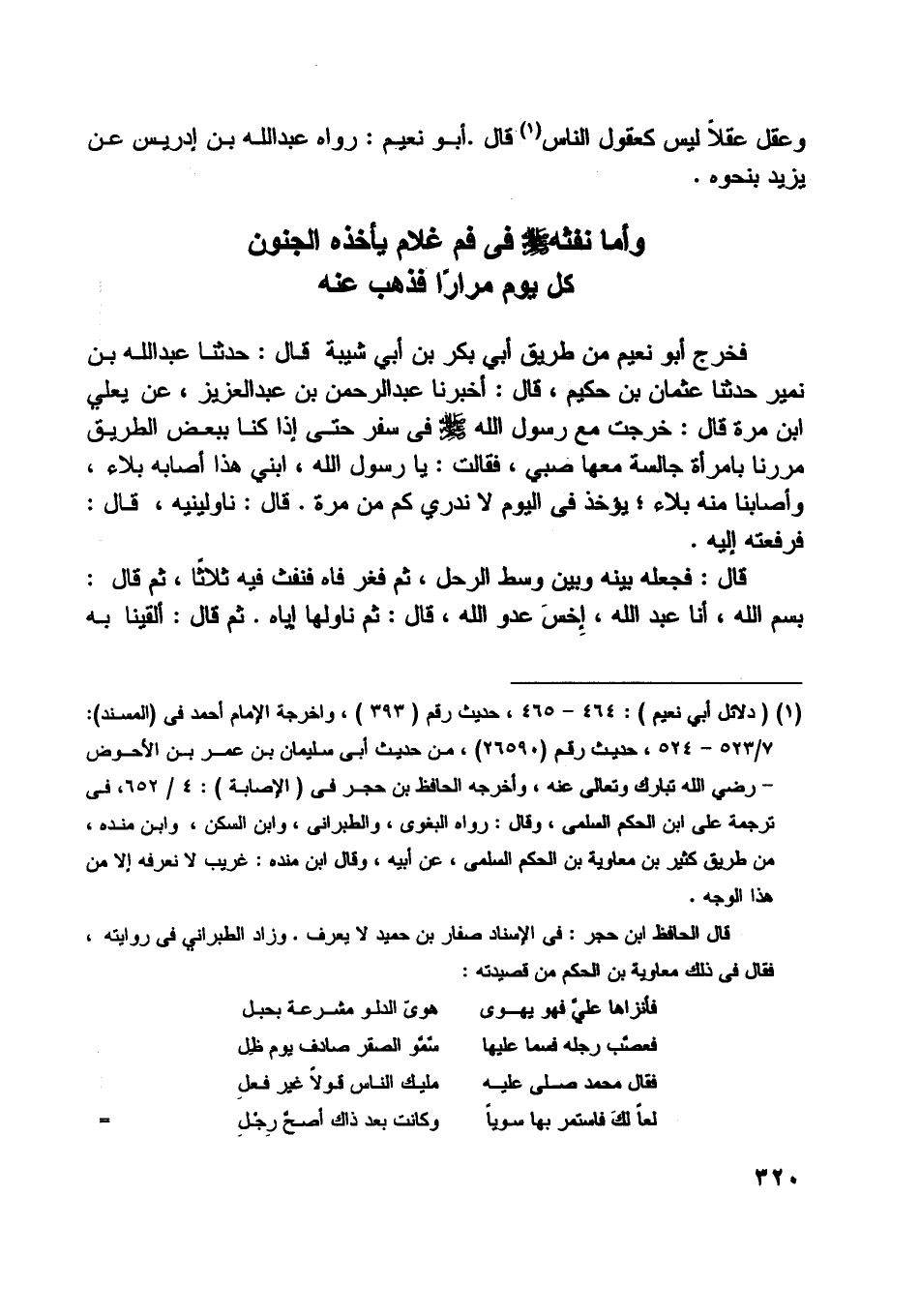 فخرج أبو نعيم من طريق أبي بكر بن أبي شيبة قال: حدثنا عبد اللَّه بن نمير حدثنا عثمان بن حكيم، قال: أخبرنا عبد الرحمن بن عبد العزيز، عن يعلي ابن مرة قال: خرجت مع رسول اللَّه صلّى اللَّه عليه وسلّم في سفر حتى إذا كنا ببعض الطريق مررنا بامرأة جالسة معها صبي، فقالت: يا رسول اللَّه، ابني هذا أصابه بلاء، وأصابنا منه بلاء، يؤخذ في اليوم لا ندري كم من مرة. قال: ناولينيه، قال: