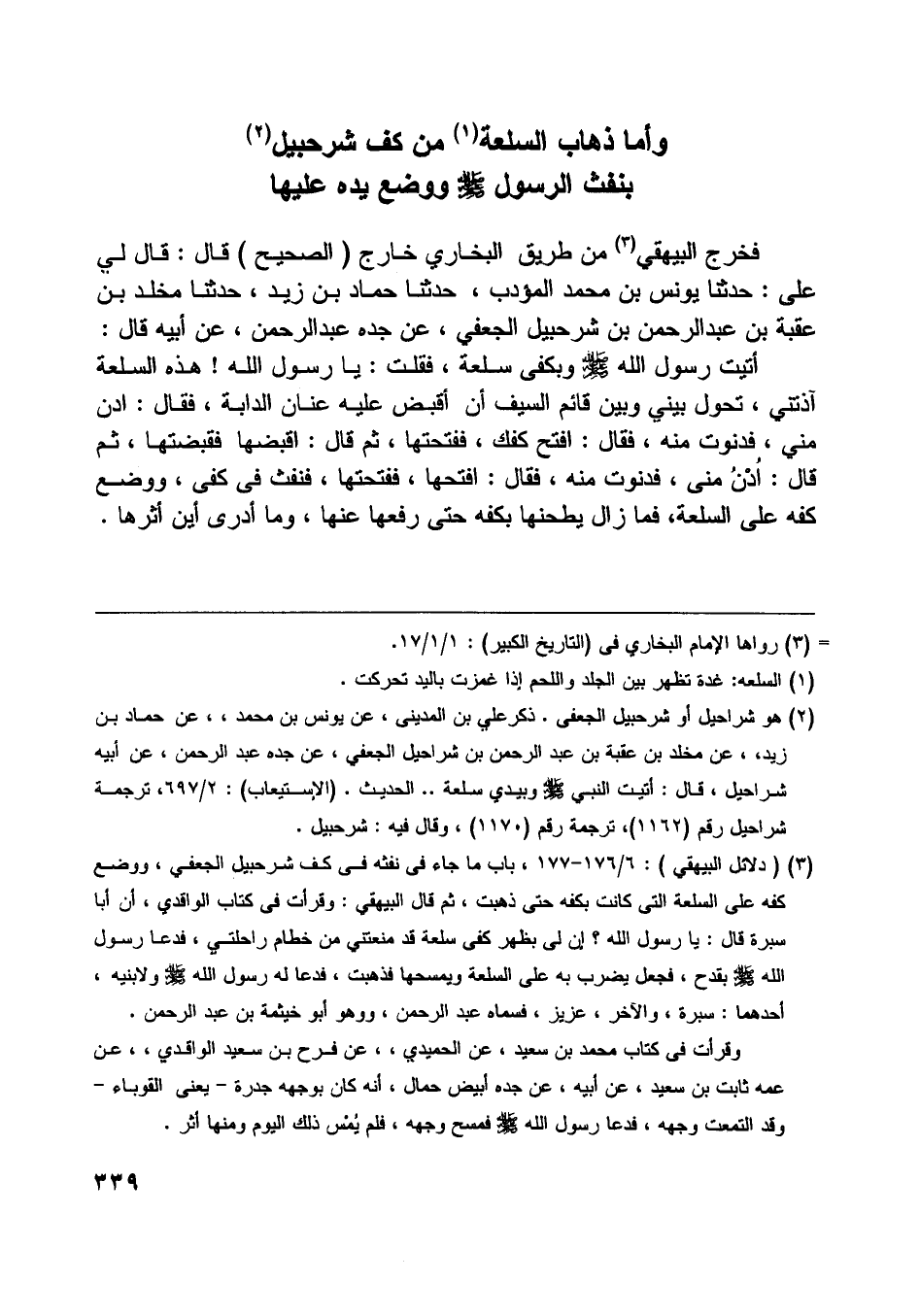 فخرج البيهقي [ (3) ] من طريق البخاري خارج (الصحيح) قال: قال لي على: حدثنا يونس بن محمد المؤدب، حدثنا حماد بن زيد، حدثنا مخلد بن عقبة بن عبد الرحمن بن شرحبيل الجعفي، عن جده عبد الرحمن، عن أبيه قال: أتيت رسول اللَّه صلّى اللَّه عليه وسلّم وبكفى سلعة، فقلت: يا رسول اللَّه! هذه السلعة آذتني، تحول بيني وبين قائم السيف أن أقبض عليه عنان الدابة، فقال: ادن مني، فدنوت منه، فقال: افتح كفك، ففتحتها، ثم قال: اقبضها فقبضتها، ثم قال: ادن منى، فدنوت منه، فقال: افتحها، ففتحتها، فنفث في كفى، ووضع كفه على السلعة، فما زال يطحنها بكفه حتى رفعها عنها، وما أدرى أين أثرها.