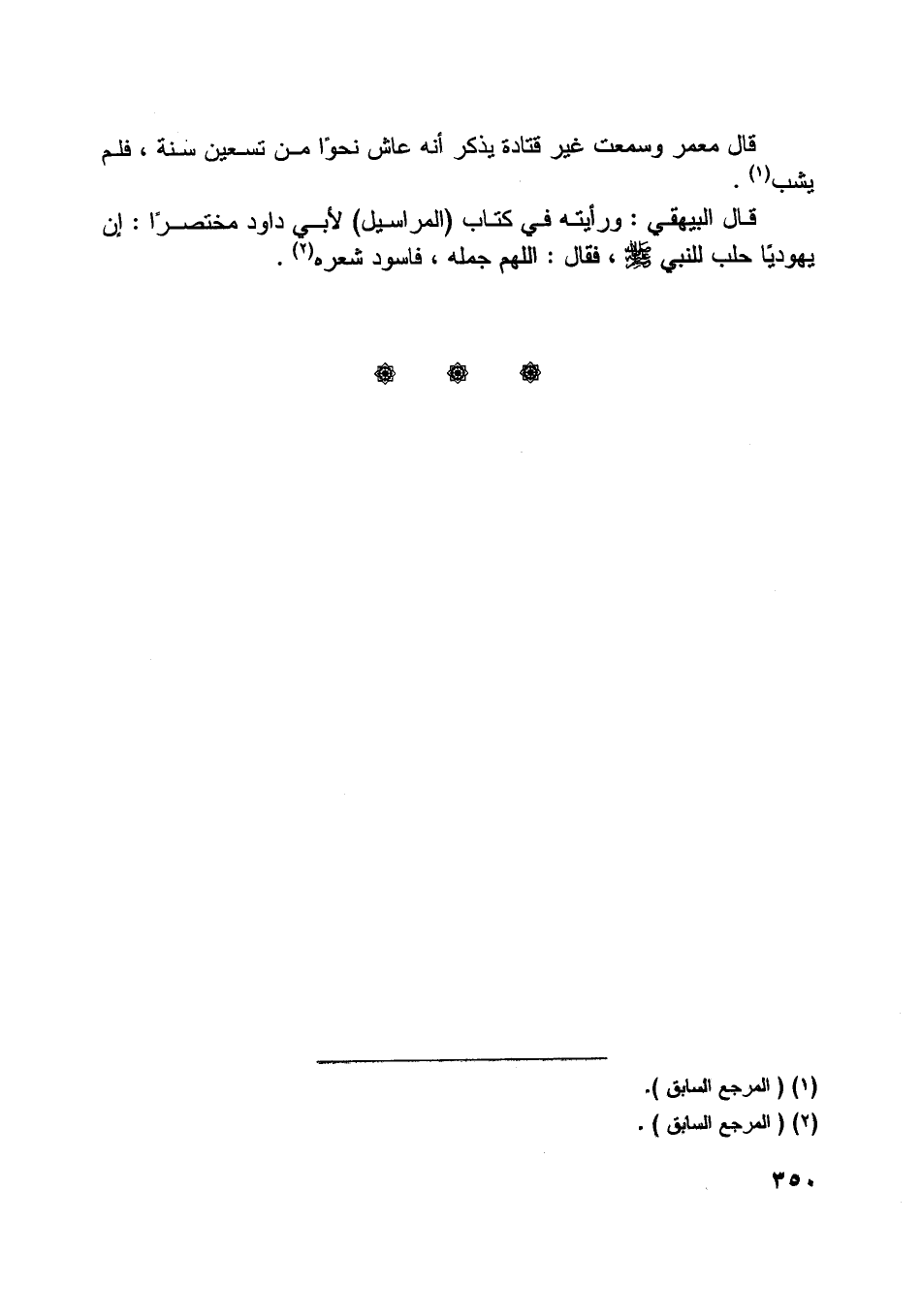 قال البيهقي: ورأيته في كتاب (المراسيل) لأبي داود مختصرا: إن يهوديا حلب للنّبيّ صلّى اللَّه عليه وسلّم، فقال: اللَّهمّ جمله، فاسود شعره [ (2) ] .