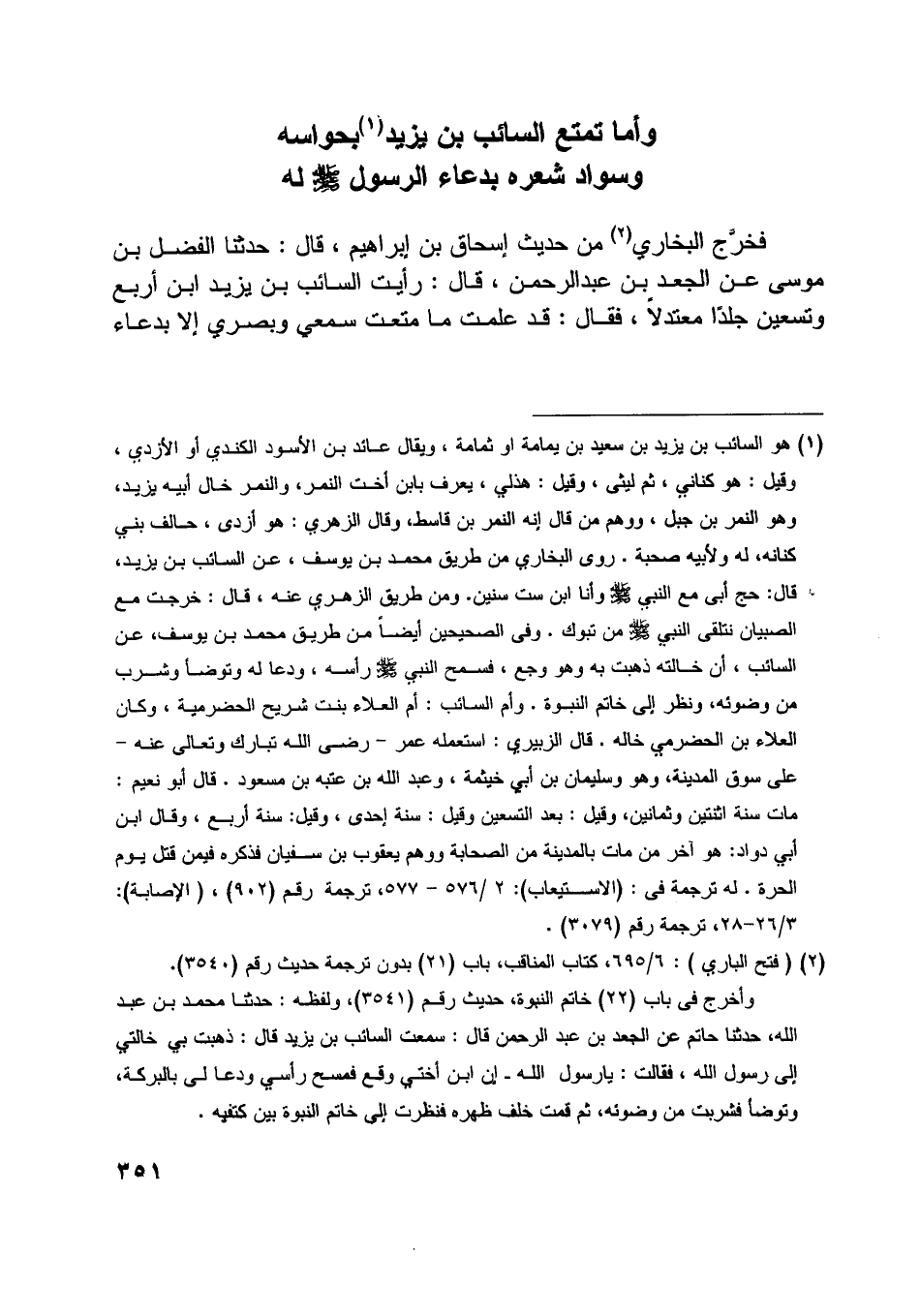 وأما تمتع السائب بن يزيد [ (1) ] بحواسه وسواد شعره بدعاء الرسول صلّى اللَّه عليه وسلّم له