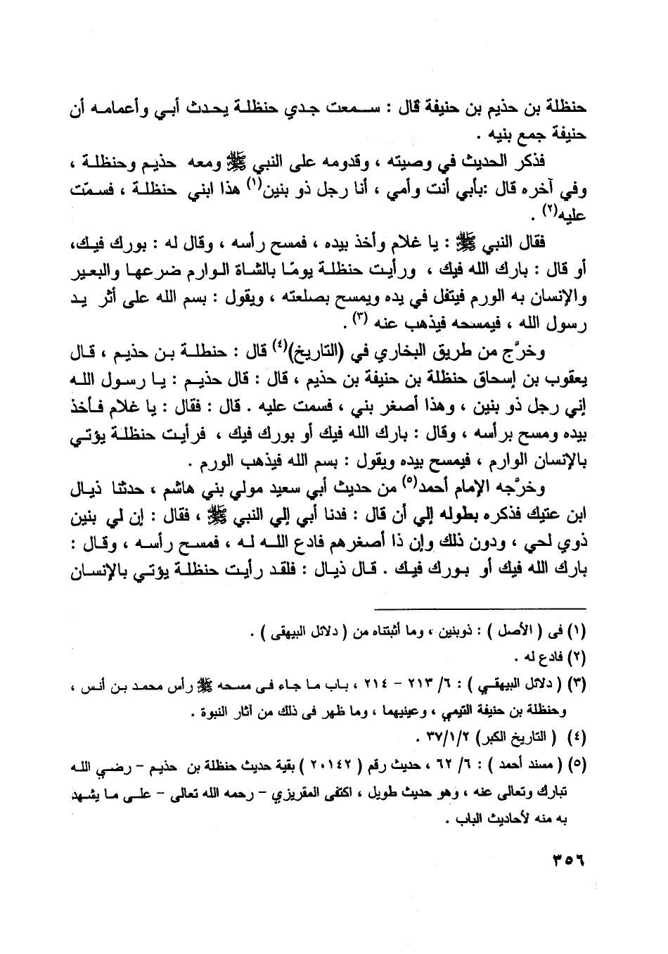 [ (3) ] (دلائل البيهقي) : 6/ 213- 214، باب ما جاء في مسحه صلّى اللَّه عليه وسلّم رأس محمد بن أنس، وحنظلة بن حنيفة التيمي، وعينيهما، وما ظهر في ذلك من آثار النبوة.