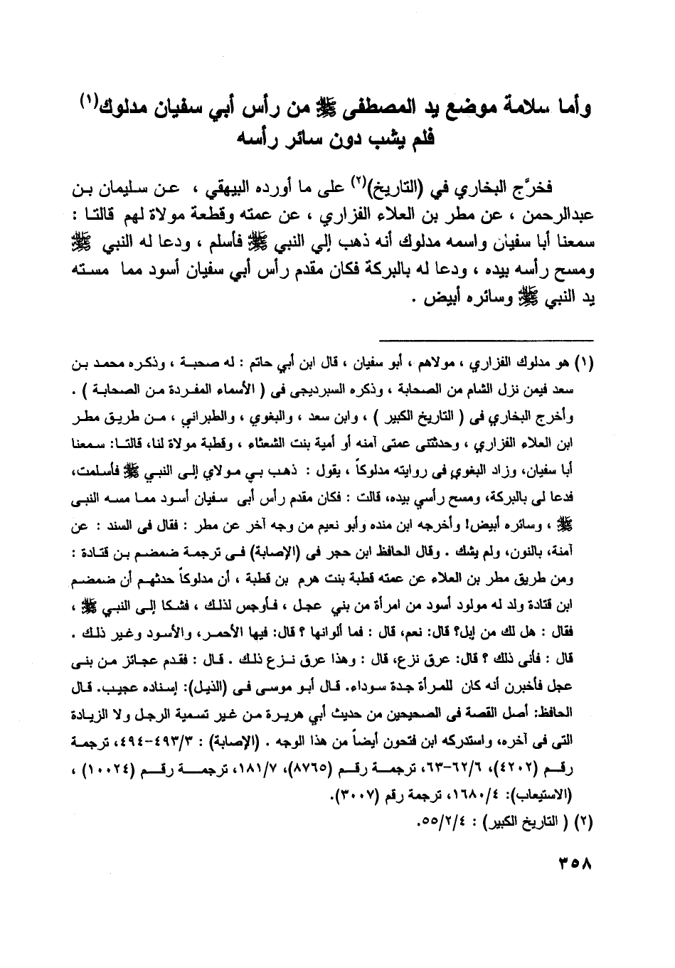 وأما سلامة موضع يد المصطفى صلّى اللَّه عليه وسلّم من رأس أبي سفيان مدلوك [ (1) ] فلم يشب دون سائر رأسه