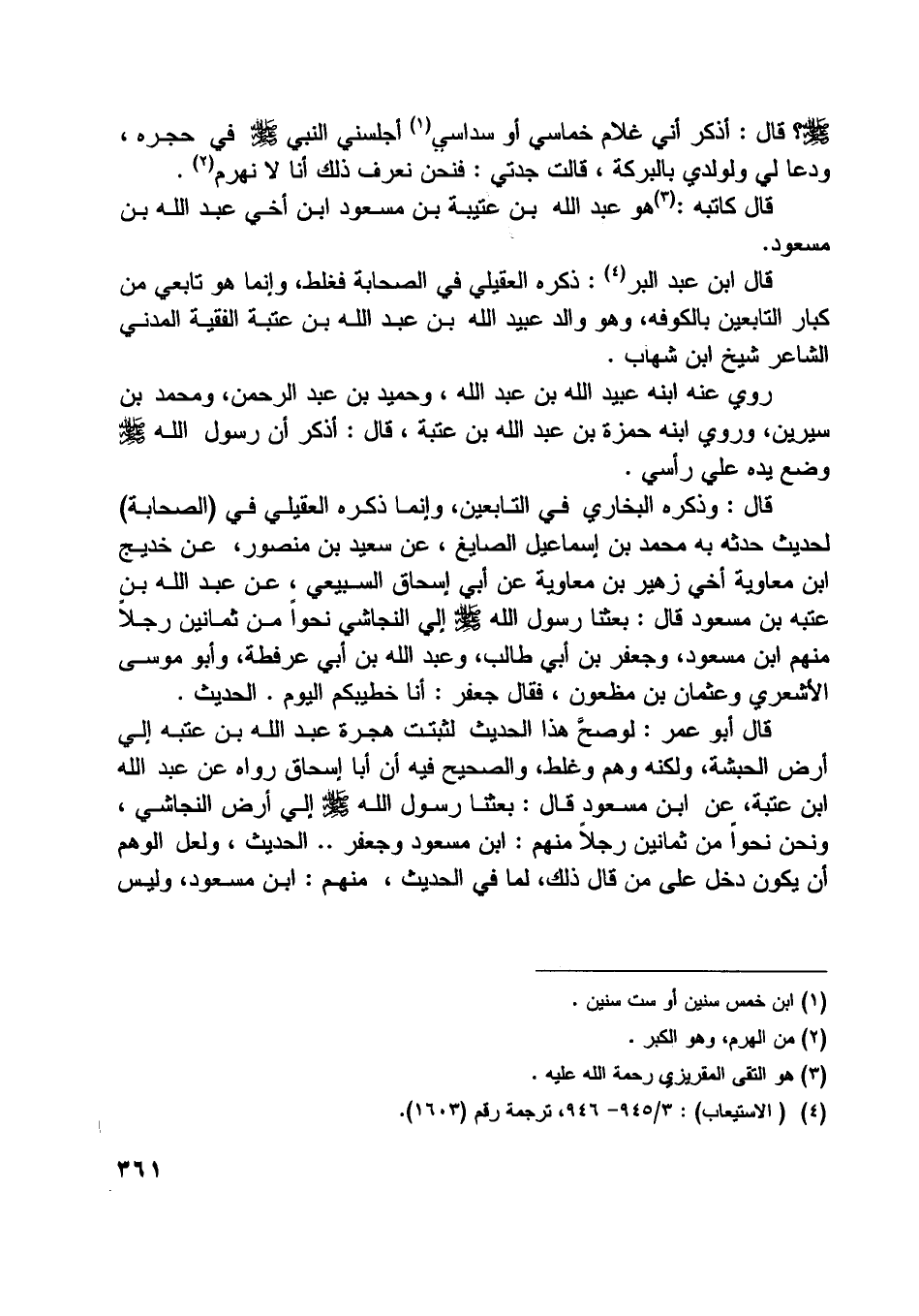 قال أبو عمر: لو صحّ هذا الحديث لثبتت هجرة عبد اللَّه بن عتبة إلى أرض الحبشة، ولكنه وهم وغلط، والصحيح فيه أن أبا إسحاق رواه عن عبد اللَّه ابن عتبة، عن ابن مسعود قال: بعثنا رسول اللَّه صلّى اللَّه عليه وسلّم إلي أرض النجاشي، ونحن نحوا من ثمانين رجلا منهم: ابن مسعود وجعفر ... الحديث، ولعل الوهم أن يكون دخل على من قال ذلك، لما في الحديث، منهم: ابن مسعود، وليس