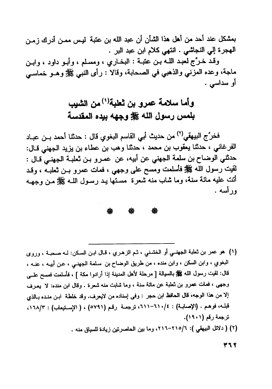 وأما سلامة عمرو بن ثعلبة [ (1) ] من الشيب بلمس رسول اللَّه صلّى اللَّه عليه وسلّم وجهه بيده المقدسة