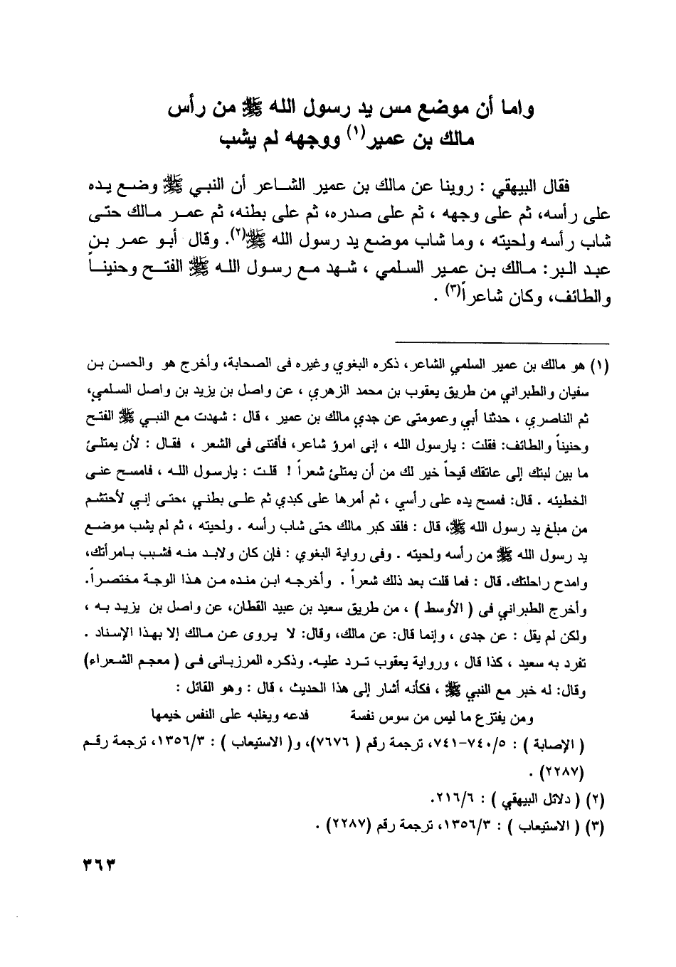 واما أن موضع مس يد رسول اللَّه صلّى اللَّه عليه وسلّم من رأس مالك بن عمير [ (1) ] ووجهه لم يشب