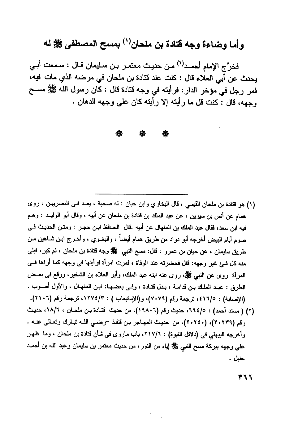 فخرّج الإمام أحمد [ (2) ] من حديث معتمر بن سليمان قال: سمعت أبي يحدث عن أبي العلاء قال: كنت عند قتادة بن ملحان في مرضه الّذي مات فيه، فمر رجل في مؤخر الدار، فرأيته في وجه قتادة قال: كان رسول اللَّه صلّى اللَّه عليه وسلّم مسح وجهه، قال: كنت قل ما رأيته إلا رأيته كان على وجهه الدهان.