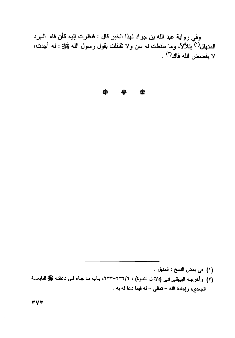 [ (2) ] وأخرجه البيهقي في (دلائل النبوة) : 6/ 232- 233، باب ما جاء في دعائه صلّى اللَّه عليه وسلّم للنابغة الجعديّ، وإجابة اللَّه- تعالى- له فيما دعا له به.