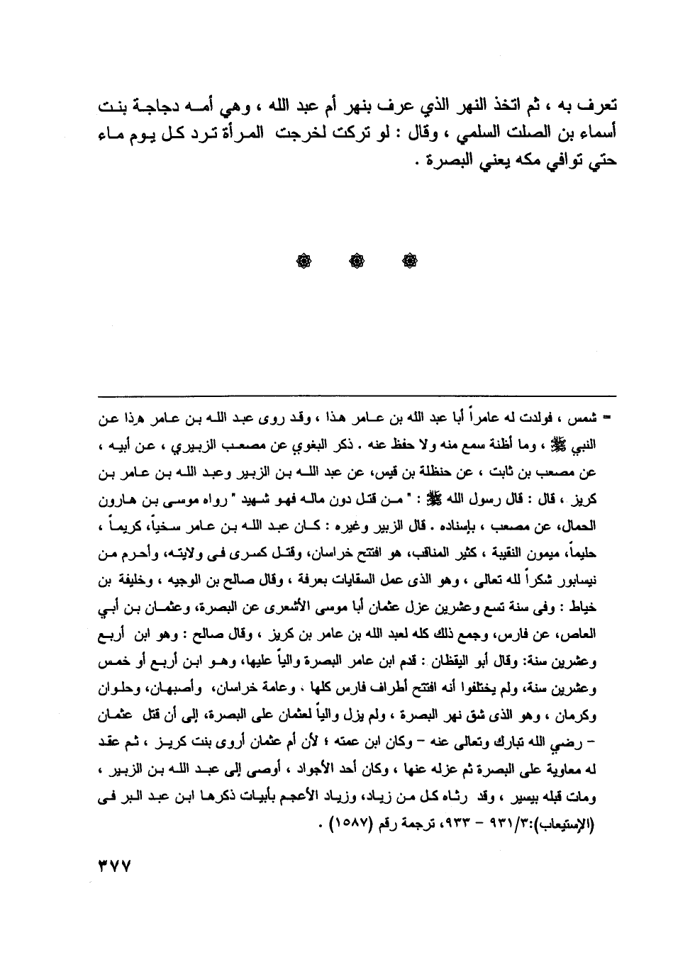 قال الزبير وغيره: كان عبد اللَّه بن عامر سخيا، كريما، حليما، ميمون النقيبة، كثير المناقب، هو افتتح خراسان، وقتل كسرى في ولايته، وأحرم من نيسابور شكرا للَّه تعالى، وهو الّذي عمل السقايات بعرفة، وقال صالح بن الوجيه، وخليفة بن خياط: وفي سنة تسع وعشرين عزل عثمان أبا موسى الأشعري عن البصرة، وعثمان بن أبي العاص، عن فارس، وجمع ذلك كله لعبد اللَّه بن عامر بن كريز، وقال صالح: وهو ابن أربع وعشرين سنة: وقال أبو اليقظان: قدم ابن عامر البصرة واليا عليها، وهو ابن أربع أو خمس وعشرين سنة، ولم يختلفوا أنه افتتح أطراف فارس كلها. وعامة خراسان، وأصبهان، وحلوان وكرمان، وهو الّذي شق نهر البصرة، ولم يزل واليا لعثمان على البصرة، إلى أن قتل عثمان- رضي اللَّه تبارك وتعالى عنه- وكان ابن عمته، لأن أم عثمان أروى بنت كريز، ثم عقد له معاوية على البصرة ثم عزله عنها، وكان أحد الأجواد، أوصى إلى عبد اللَّه بن الزبير، ومات قبله بيسير، وقد رثاه كل من زياد، وزياد الأعجم بأبيات ذكرها ابن عبد البر في (الإستيعاب) : 3/ 931- 933، ترجمة رقم (1587) .