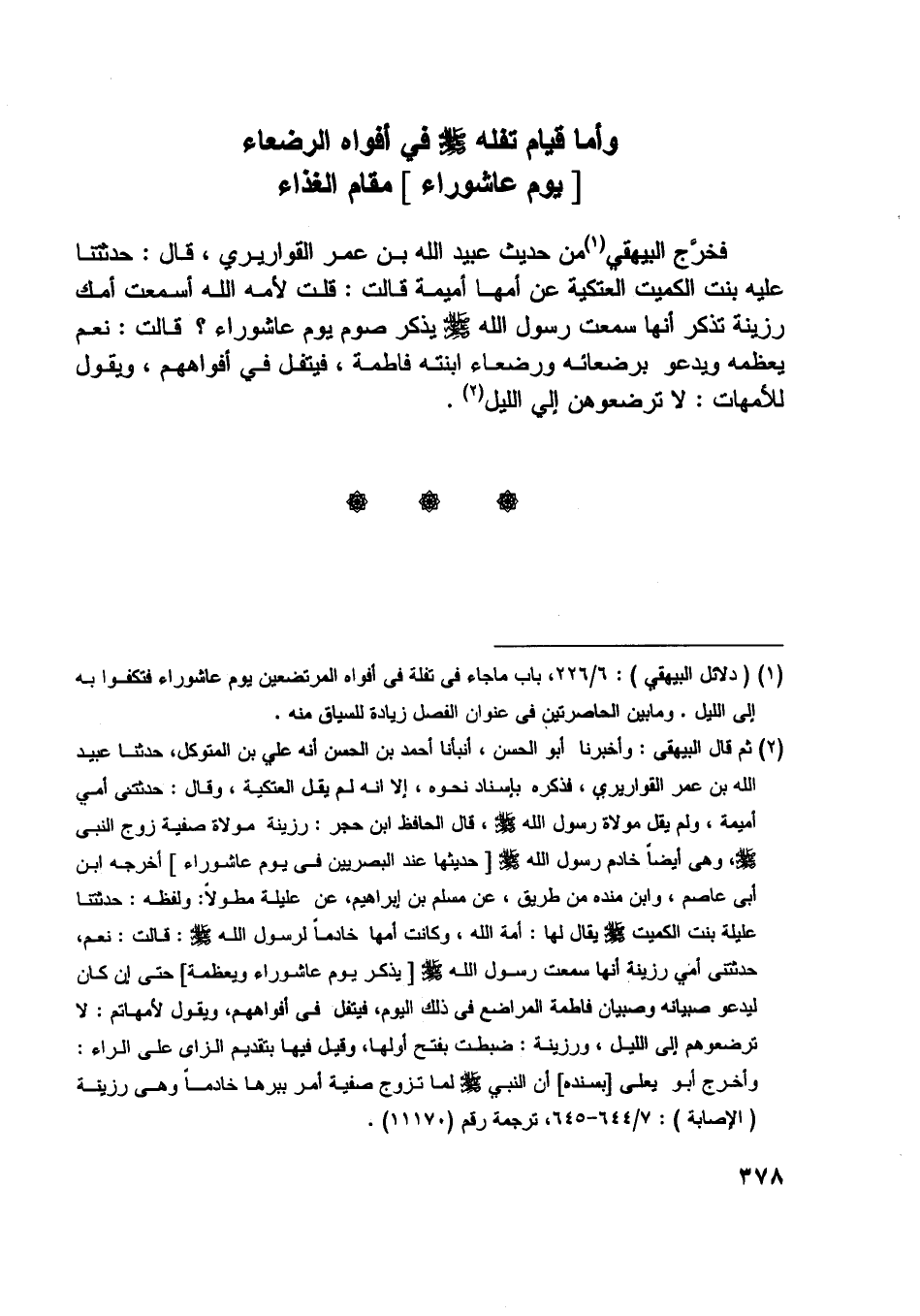 [ (1) ] (دلائل البيهقي) : 6/ 226، باب ما جاء في تفلة في أفواه المرتضعين يوم عاشوراء فتكفوا به إلى الليل. وما بين الحاصرتين في عنوان الفصل زيادة للسياق منه.
