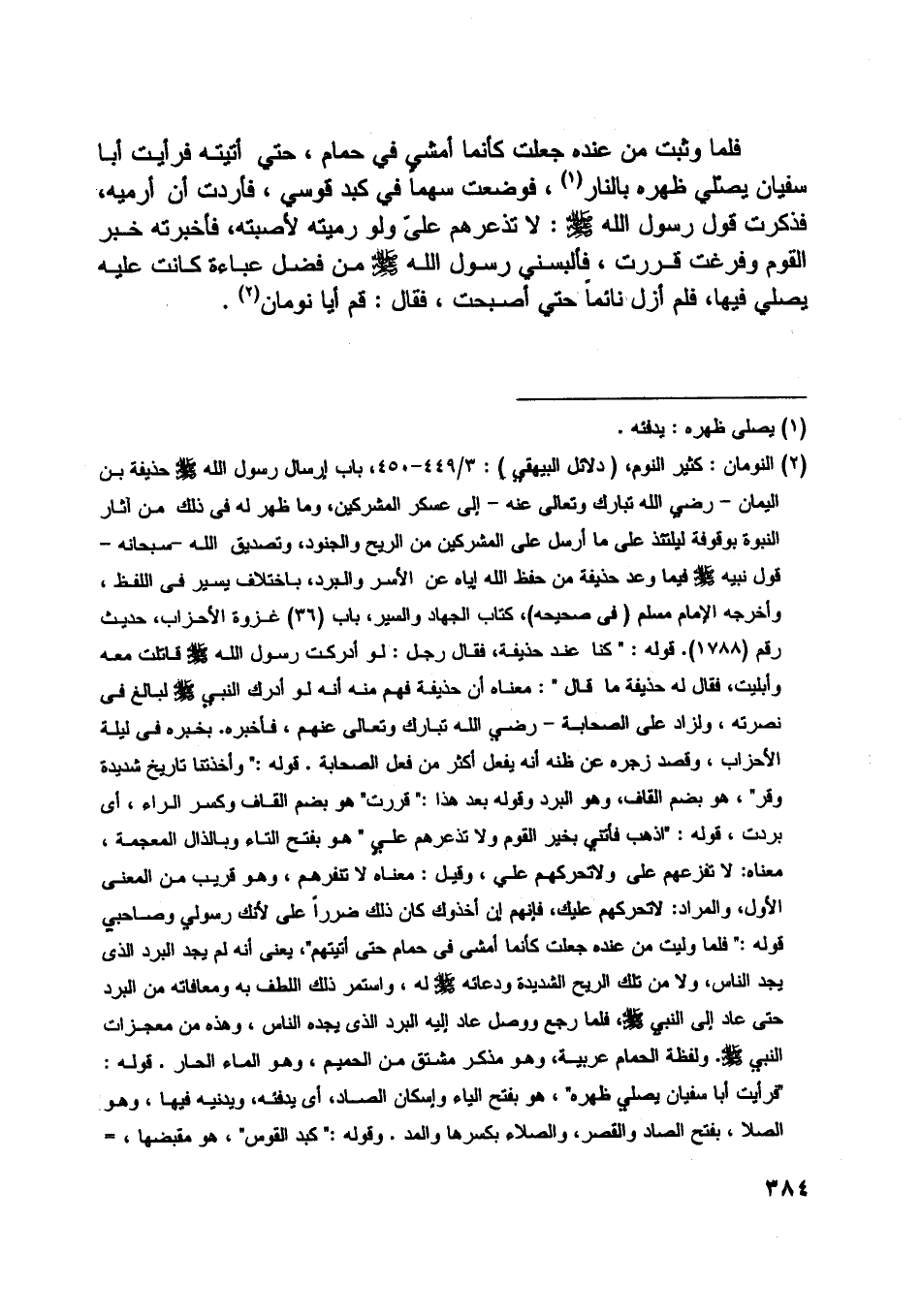 فلما وثبت من عنده جعلت كأنما أمشي في حمام، حتى أتيته فرأيت أبا سفيان يصلي ظهره بالنار [ (1) ] ، فوضعت سهما في كبد قوسي، فأردت أن أرميه، فذكرت قول رسول اللَّه صلّى اللَّه عليه وسلّم: لا تذعرهم عليّ ولو رميته لأصبته، فأخبرته خبر القوم وفرغت قررت، فألبسني رسول اللَّه صلّى اللَّه عليه وسلّم من فضل عباءة كانت عليه يصلي فيها، فلم أزل نائما حتى أصبحت، فقال: قم أيا نومان [ (2) ] .