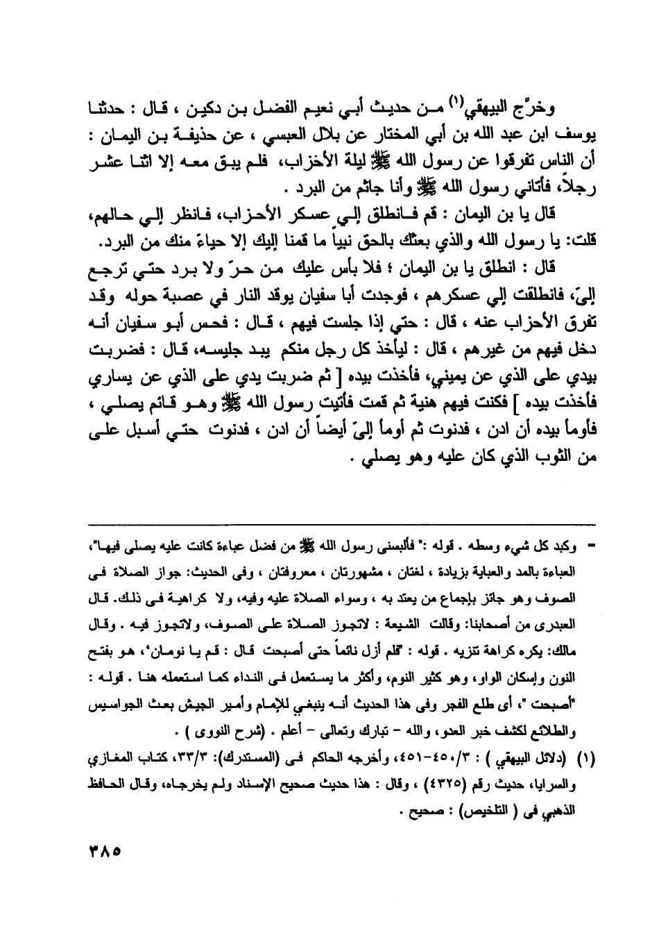 قال يا بن اليمان: قم فانطلق إلي عسكر الأحزاب، فانظر إلى حالهم، قلت: يا رسول اللَّه والّذي بعثك بالحق نبيا ما قمنا إليك إلا حياء منك من البرد.