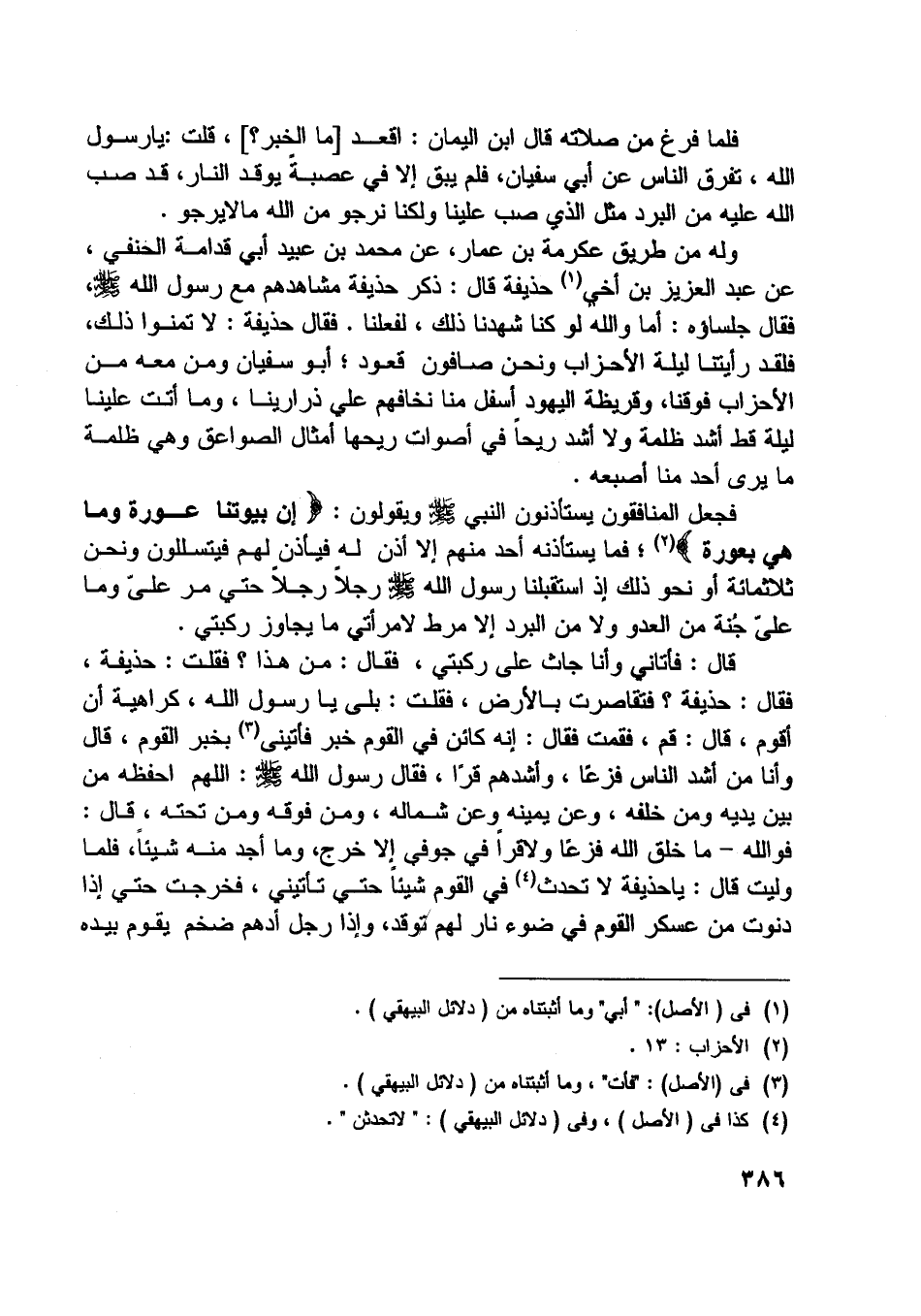 فلما فرغ من صلاته قال ابن اليمان: اقعد [ما الخبر؟] ، قلت: يا رسول اللَّه، تفرق الناس عن أبي سفيان، فلم يبق إلا في عصبة يوقد النار، قد صب اللَّه عليه من البرد مثل الّذي صب علينا ولكنا نرجو من اللَّه ما لا يرجو.